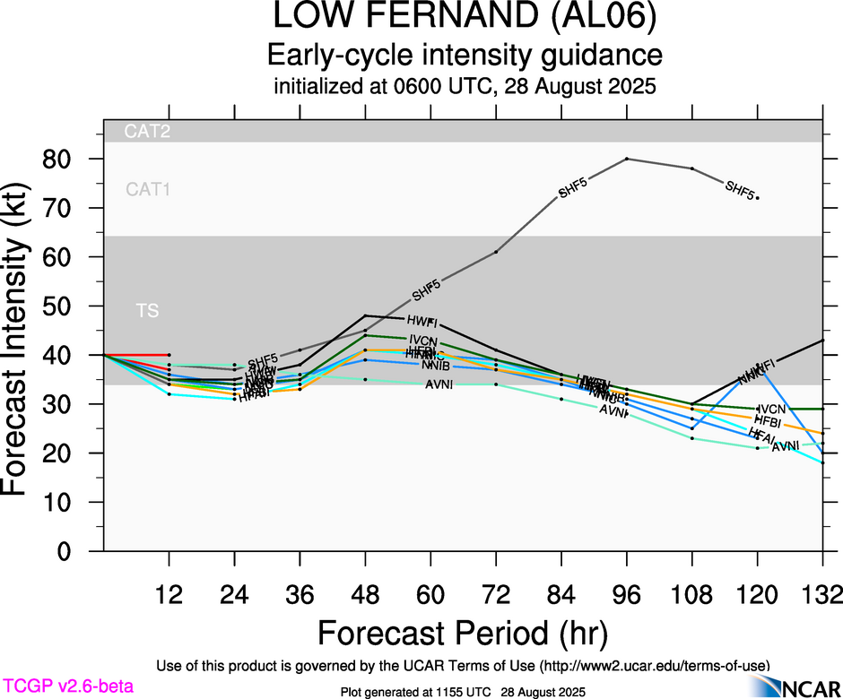 This page provides plots and information for SIX (AL06). The left side of this page provides TCGP-generated plots of numerical guidance and other TCGP-curated data. The right side of this page provides external links to additional information and products. Most of the model guidance displayed in the plots come from modeling centers outside of NCAR, such as NOAA, other national numerical weather prediction centers, and universities. Click here for information about who contributes to TCGP. Your use of this page is governed by the UCAR Terms of Service and this site's disclaimer. To obtain help for any item on this page, click on the question mark beside that item.
