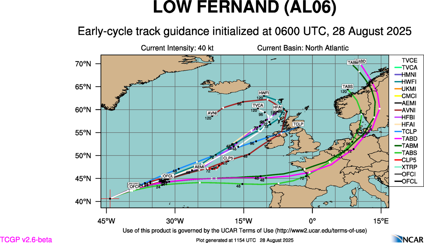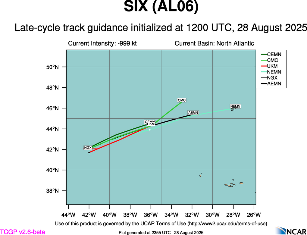 At 1200 UTC, 28 August 2025, SIX (AL06) was located in the North Atlantic basin at 42.3°N and 42.3°W. The current intensity was -999 kt and the center was moving at -999 kt at a bearing of -999 degrees. The minimum central pressure was -999 mb.