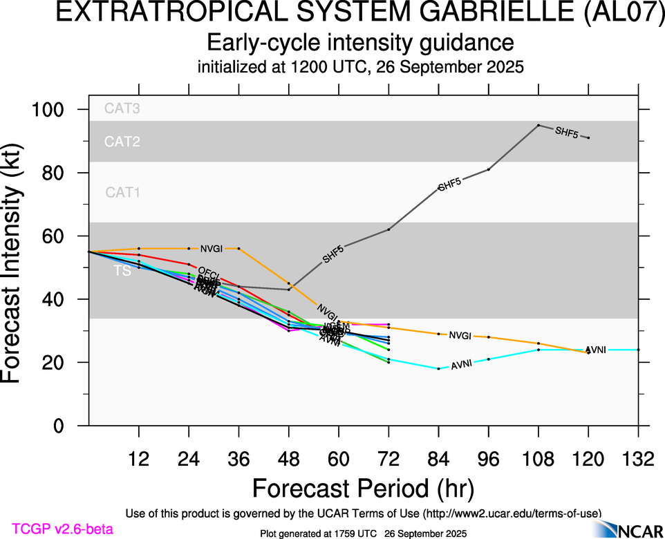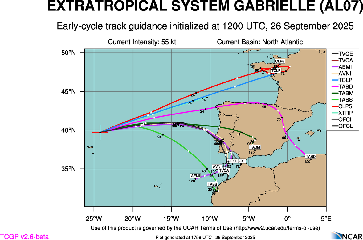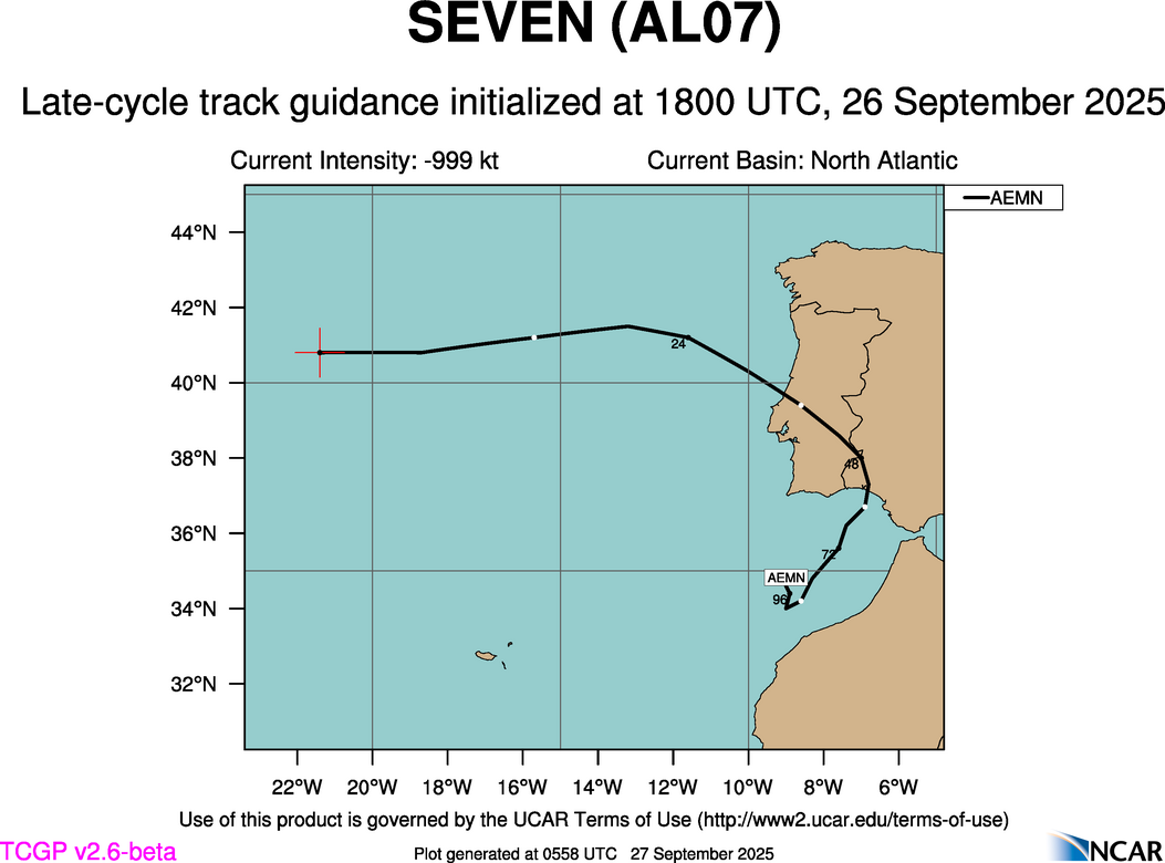 At 1800 UTC, 26 September 2025, SEVEN (AL07) was located in the North Atlantic basin at 40.9°N and 21.7°W. The current intensity was -999 kt and the center was moving at -999 kt at a bearing of -999 degrees. The minimum central pressure was -999 mb.