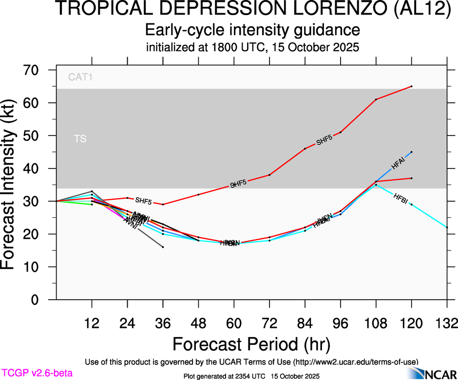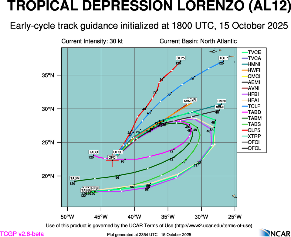 This page provides plots and information for TWELVE (AL12). The left side of this page provides TCGP-generated plots of numerical guidance and other TCGP-curated data. The right side of this page provides external links to additional information and products. Most of the model guidance displayed in the plots come from modeling centers outside of NCAR, such as NOAA, other national numerical weather prediction centers, and universities. Click here for information about who contributes to TCGP. Your use of this page is governed by the UCAR Terms of Service and this site's disclaimer. To obtain help for any item on this page, click on the question mark beside that item.