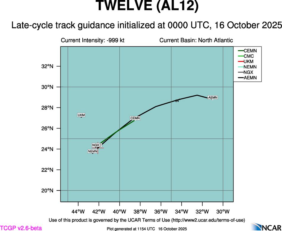 At 0000 UTC, 16 October 2025, TWELVE (AL12) was located in the North Atlantic basin at 24.5°N and 42.4°W. The current intensity was -999 kt and the center was moving at -999 kt at a bearing of -999 degrees. The minimum central pressure was -999 mb.