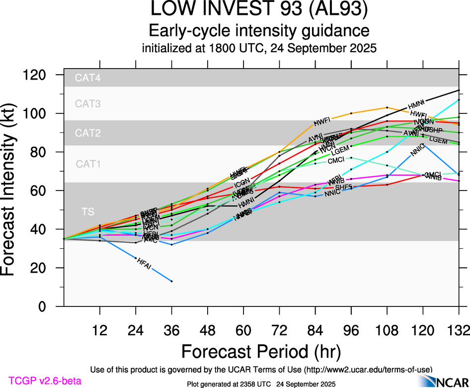 This page provides plots and information for LOW INVEST 93 (AL93). The left side of this page provides TCGP-generated plots of numerical guidance and other TCGP-curated data. The right side of this page provides external links to additional information and products. Most of the model guidance displayed in the plots come from modeling centers outside of NCAR, such as NOAA, other national numerical weather prediction centers, and universities. Click here for information about who contributes to TCGP. Your use of this page is governed by the UCAR Terms of Service and this site's disclaimer. To obtain help for any item on this page, click on the question mark beside that item.