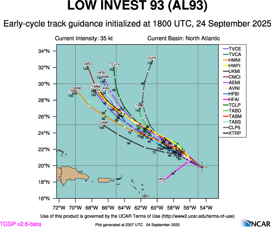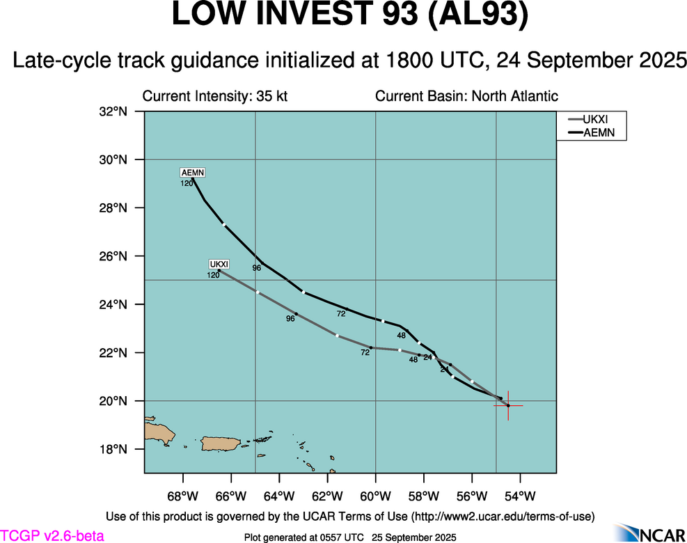 At 1800 UTC, 24 September 2025, LOW INVEST 93 (AL93) was located in the North Atlantic basin at 19.8°N and 54.5°W. The current intensity was 35 kt and the center was moving at 14 kt at a bearing of 300 degrees. The minimum central pressure was 1008 mb.
