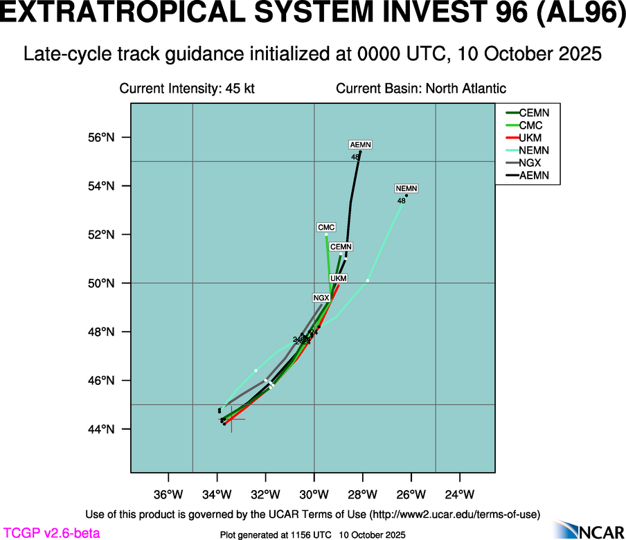 At 0000 UTC, 10 October 2025, EXTRATROPICAL SYSTEM INVEST 96 (AL96) was located in the North Atlantic basin at 44.4°N and 33.4°W. The current intensity was 45 kt and the center was moving at 6 kt at a bearing of 35 degrees. The minimum central pressure was 998 mb.