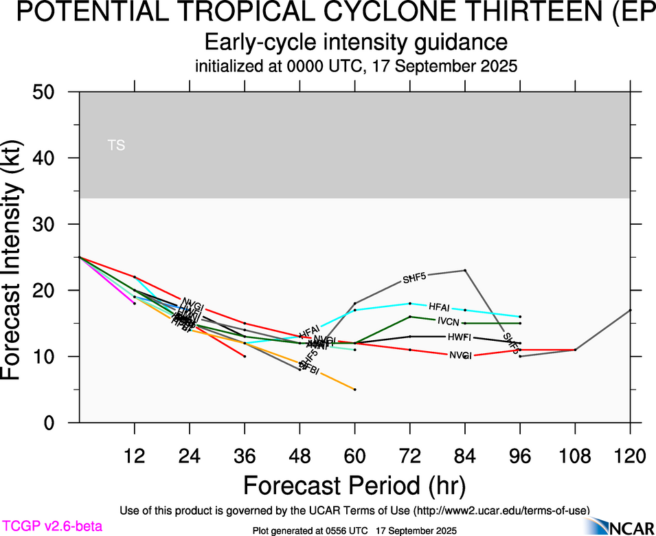 This page provides plots and information for THIRTEEN (EP13). The left side of this page provides TCGP-generated plots of numerical guidance and other TCGP-curated data. The right side of this page provides external links to additional information and products. Most of the model guidance displayed in the plots come from modeling centers outside of NCAR, such as NOAA, other national numerical weather prediction centers, and universities. Click here for information about who contributes to TCGP. Your use of this page is governed by the UCAR Terms of Service and this site's disclaimer. To obtain help for any item on this page, click on the question mark beside that item.