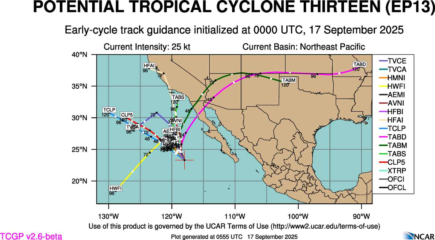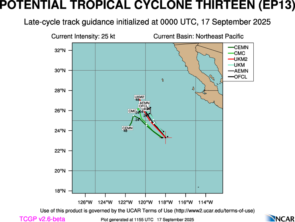 At 0600 UTC, 17 September 2025, THIRTEEN (EP13) was located in the Northeast Pacific basin at 24.4°N and 118.6°W. The current intensity was -999 kt and the center was moving at -999 kt at a bearing of -999 degrees. The minimum central pressure was -999 mb.
