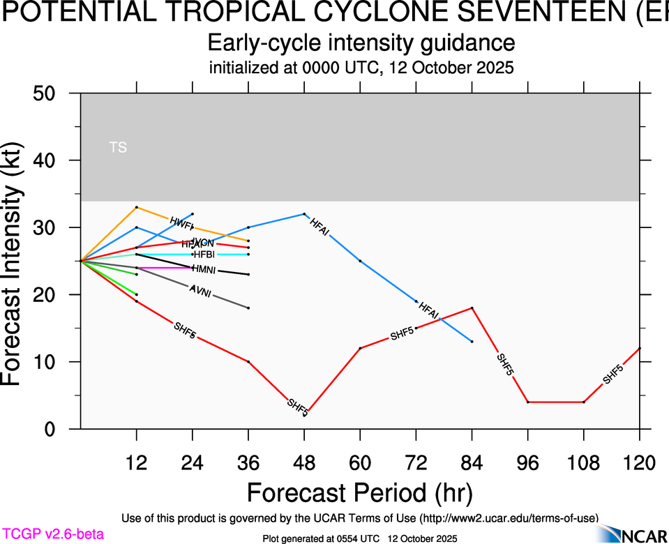 This page provides plots and information for SEVENTEEN (EP17). The left side of this page provides TCGP-generated plots of numerical guidance and other TCGP-curated data. The right side of this page provides external links to additional information and products. Most of the model guidance displayed in the plots come from modeling centers outside of NCAR, such as NOAA, other national numerical weather prediction centers, and universities. Click here for information about who contributes to TCGP. Your use of this page is governed by the UCAR Terms of Service and this site's disclaimer. To obtain help for any item on this page, click on the question mark beside that item.