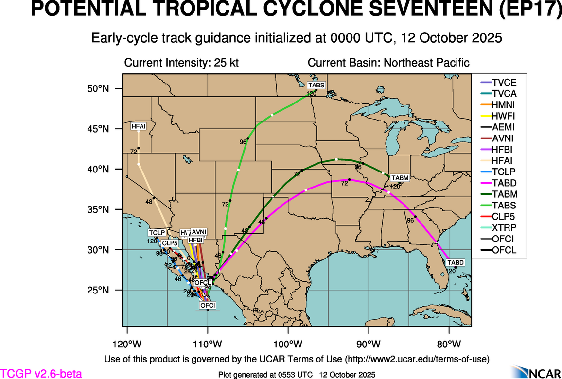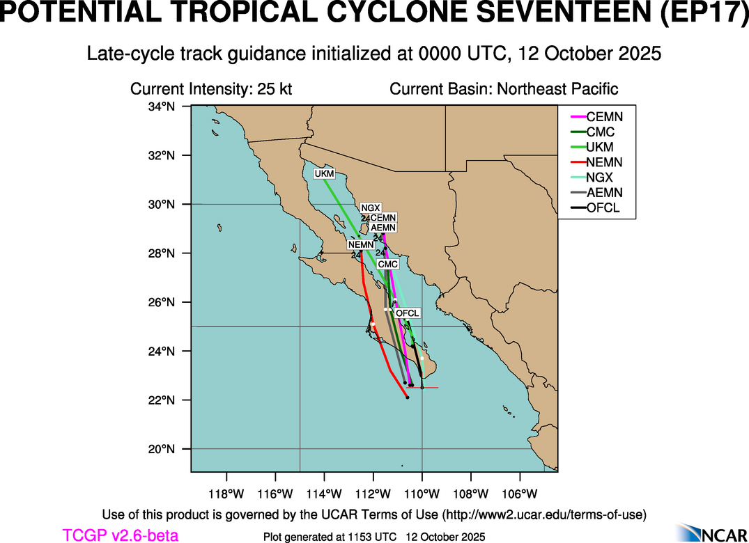 At 0600 UTC, 12 October 2025, SEVENTEEN (EP17) was located in the Northeast Pacific basin at 24.2°N and 110.4°W. The current intensity was -999 kt and the center was moving at -999 kt at a bearing of -999 degrees. The minimum central pressure was -999 mb.