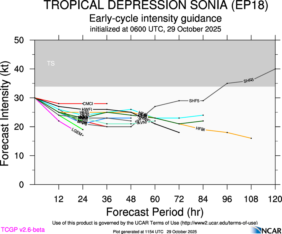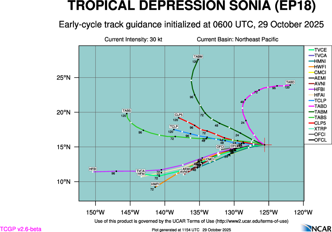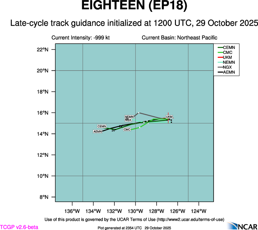 This page provides plots and information for EIGHTEEN (EP18). The left side of this page provides TCGP-generated plots of numerical guidance and other TCGP-curated data. The right side of this page provides external links to additional information and products. Most of the model guidance displayed in the plots come from modeling centers outside of NCAR, such as NOAA, other national numerical weather prediction centers, and universities. Click here for information about who contributes to TCGP. Your use of this page is governed by the UCAR Terms of Service and this site's disclaimer. To obtain help for any item on this page, click on the question mark beside that item.