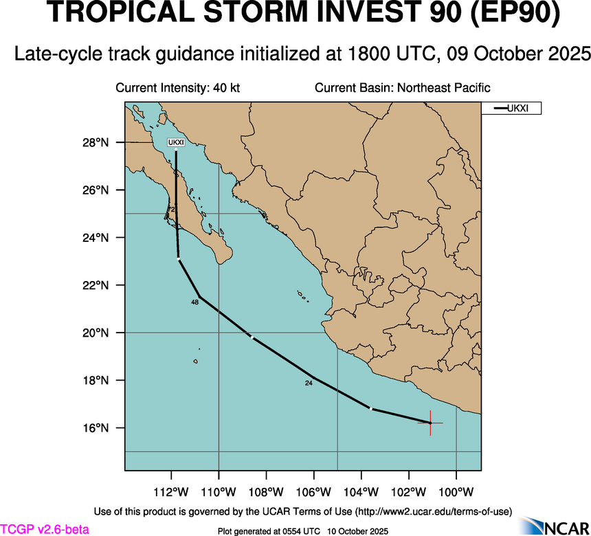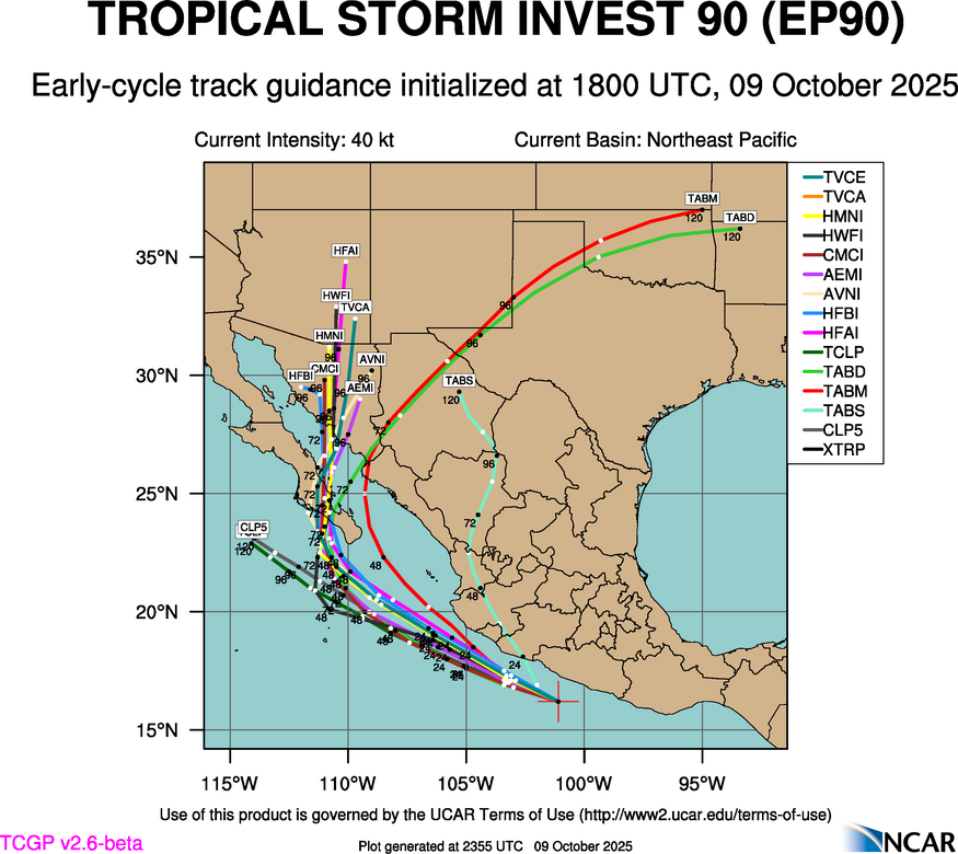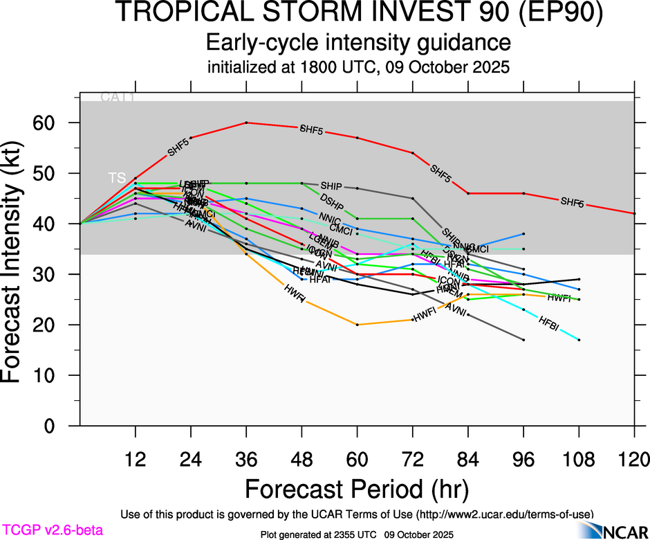 At 1800 UTC, 09 October 2025, TROPICAL STORM INVEST 90 (EP90) was located in the Northeast Pacific basin at 16.2°N and 101.1°W. The current intensity was 40 kt and the center was moving at 12 kt at a bearing of 290 degrees. The minimum central pressure was 1002 mb.