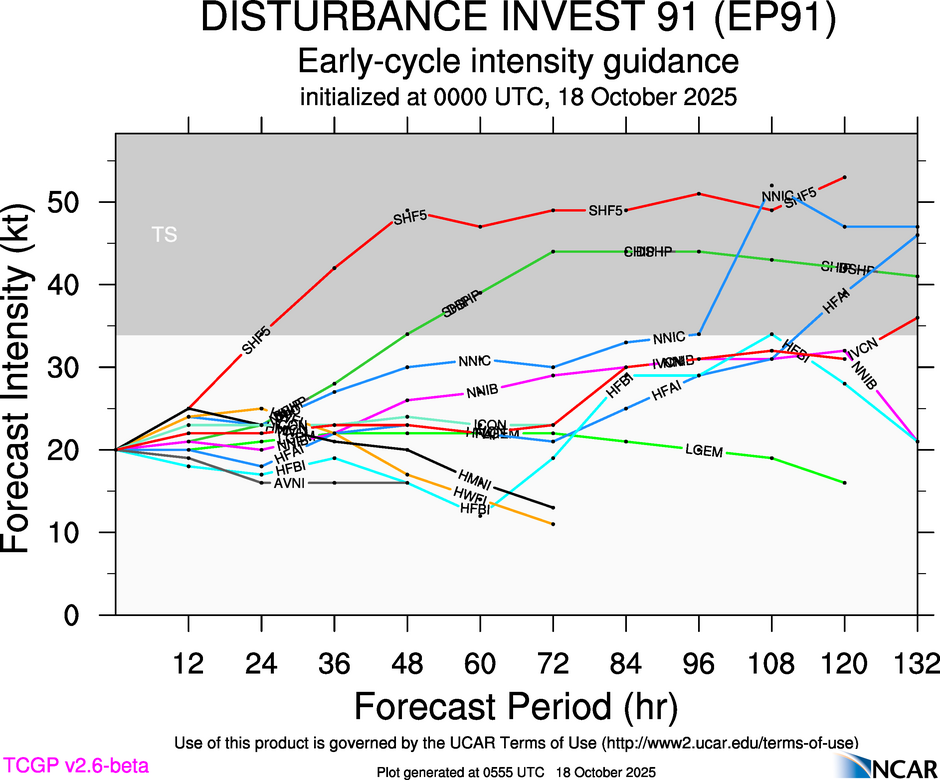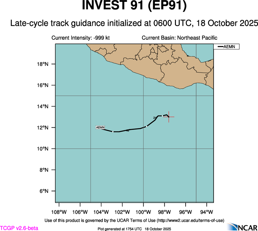 This page provides plots and information for INVEST 91 (EP91). The left side of this page provides TCGP-generated plots of numerical guidance and other TCGP-curated data. The right side of this page provides external links to additional information and products. Most of the model guidance displayed in the plots come from modeling centers outside of NCAR, such as NOAA, other national numerical weather prediction centers, and universities. Click here for information about who contributes to TCGP. Your use of this page is governed by the UCAR Terms of Service and this site's disclaimer. To obtain help for any item on this page, click on the question mark beside that item.