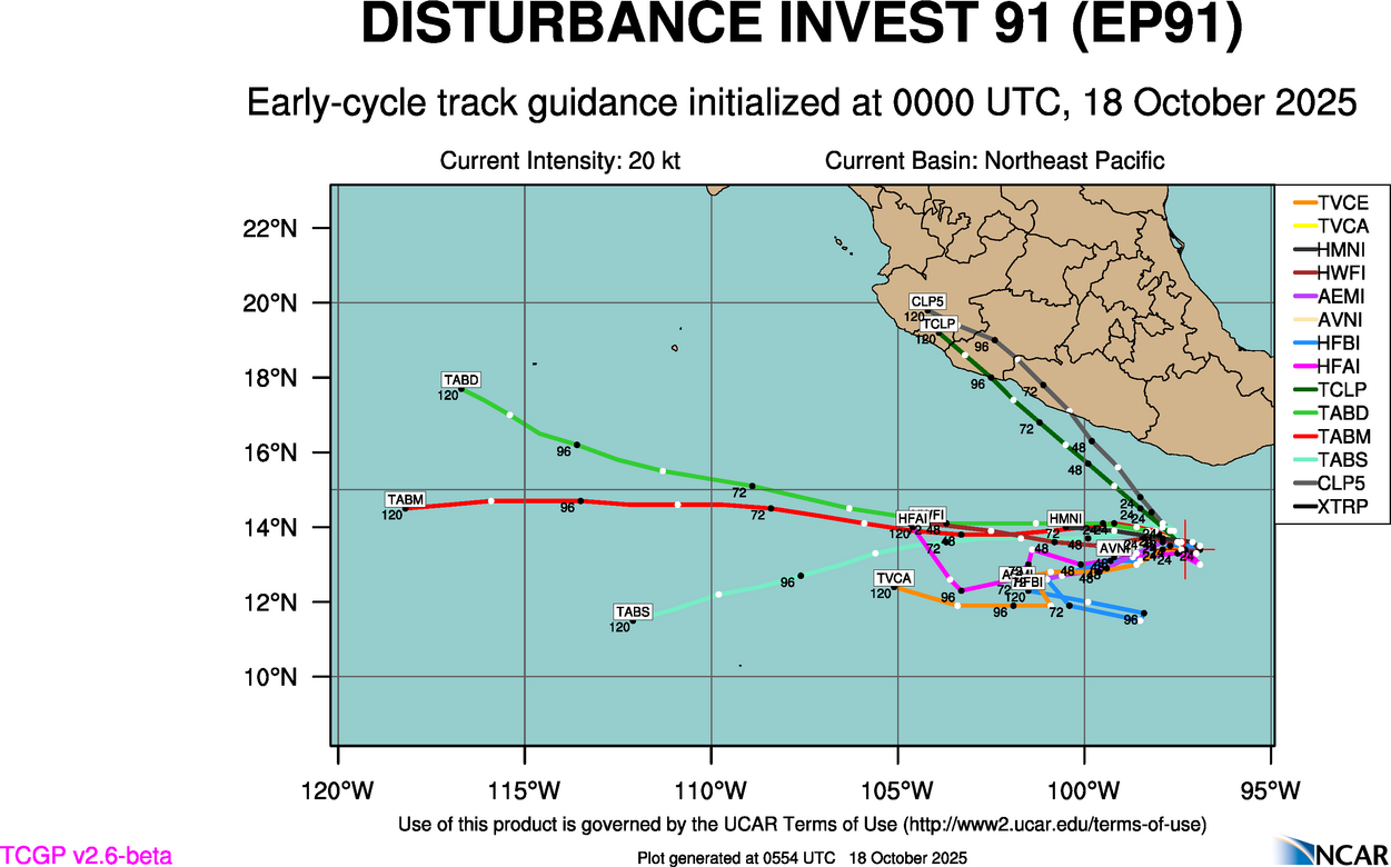 At 0600 UTC, 18 October 2025, INVEST 91 (EP91) was located in the Northeast Pacific basin at 13.3°N and 97°W. The current intensity was -999 kt and the center was moving at -999 kt at a bearing of -999 degrees. The minimum central pressure was -999 mb.