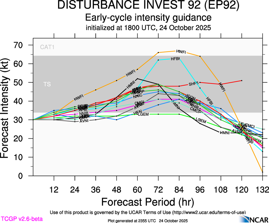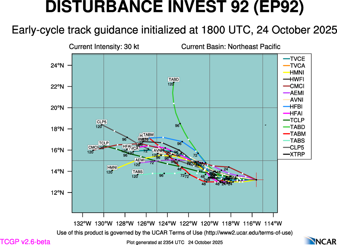 At 1800 UTC, 24 October 2025, DISTURBANCE INVEST 92 (EP92) was located in the Northeast Pacific basin at 13.2°N and 115.6°W. The current intensity was 30 kt and the center was moving at 11 kt at a bearing of 275 degrees. The minimum central pressure was 1007 mb.