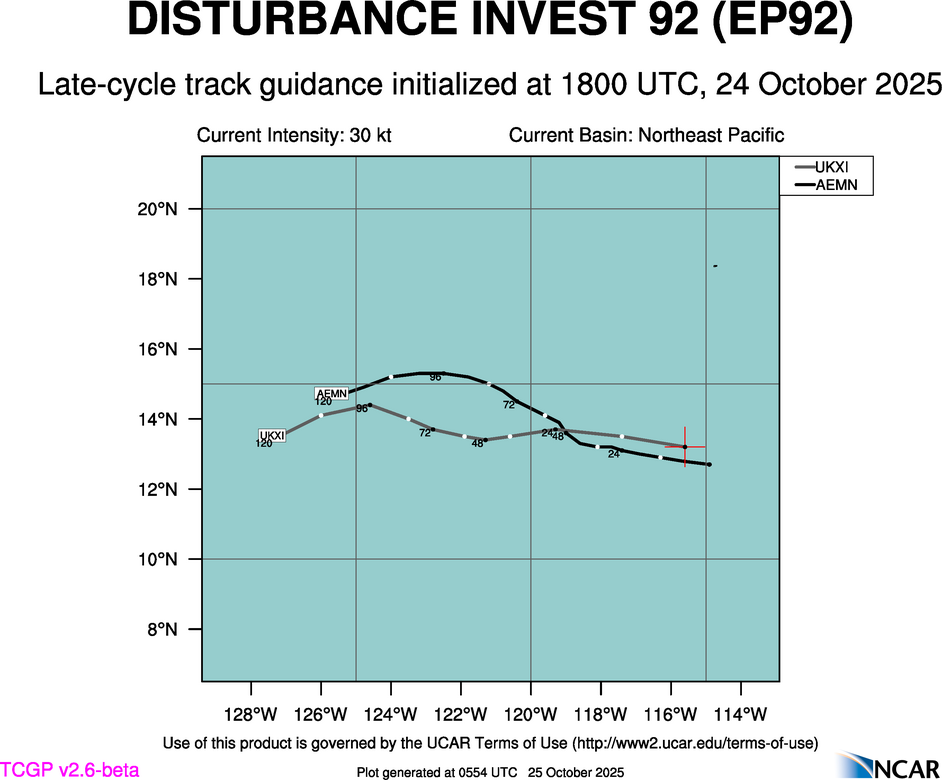 This page provides plots and information for DISTURBANCE INVEST 92 (EP92). The left side of this page provides TCGP-generated plots of numerical guidance and other TCGP-curated data. The right side of this page provides external links to additional information and products. Most of the model guidance displayed in the plots come from modeling centers outside of NCAR, such as NOAA, other national numerical weather prediction centers, and universities. Click here for information about who contributes to TCGP. Your use of this page is governed by the UCAR Terms of Service and this site's disclaimer. To obtain help for any item on this page, click on the question mark beside that item.