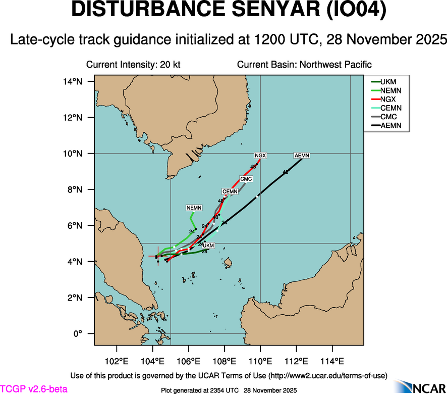 At 1800 UTC, 28 November 2025, FOUR (IO04) was located in the Northwest Pacific basin at 4.3°N and 104.9°E. The current intensity was -999 kt and the center was moving at -999 kt at a bearing of -999 degrees. The minimum central pressure was -999 mb.