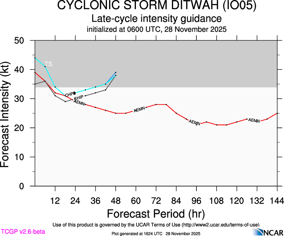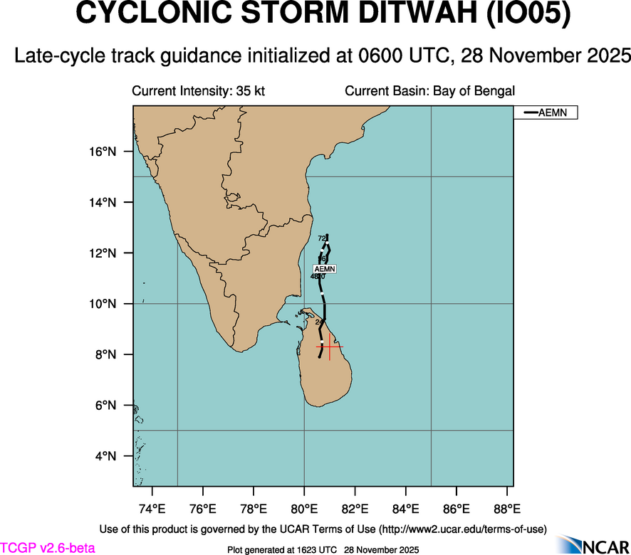 At 1200 UTC, 28 November 2025, CYCLONIC STORM DITWAH (IO05) was located in the Bay of Bengal basin at 8.6°N and 80.9°E. The current intensity was 35 kt and the center was moving at 3 kt at a bearing of 330 degrees. The minimum central pressure was 1004 mb.