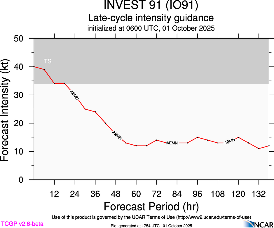 This page provides plots and information for INVEST 91 (IO91). The left side of this page provides TCGP-generated plots of numerical guidance and other TCGP-curated data. The right side of this page provides external links to additional information and products. Most of the model guidance displayed in the plots come from modeling centers outside of NCAR, such as NOAA, other national numerical weather prediction centers, and universities. Click here for information about who contributes to TCGP. Your use of this page is governed by the UCAR Terms of Service and this site's disclaimer. To obtain help for any item on this page, click on the question mark beside that item.