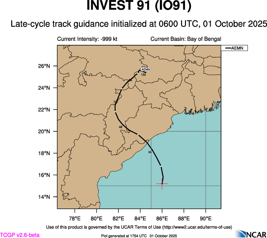 At 0600 UTC, 01 October 2025, INVEST 91 (IO91) was located in the Bay of Bengal basin at 15°N and 85.1°E. The current intensity was -999 kt and the center was moving at -999 kt at a bearing of -999 degrees. The minimum central pressure was -999 mb.