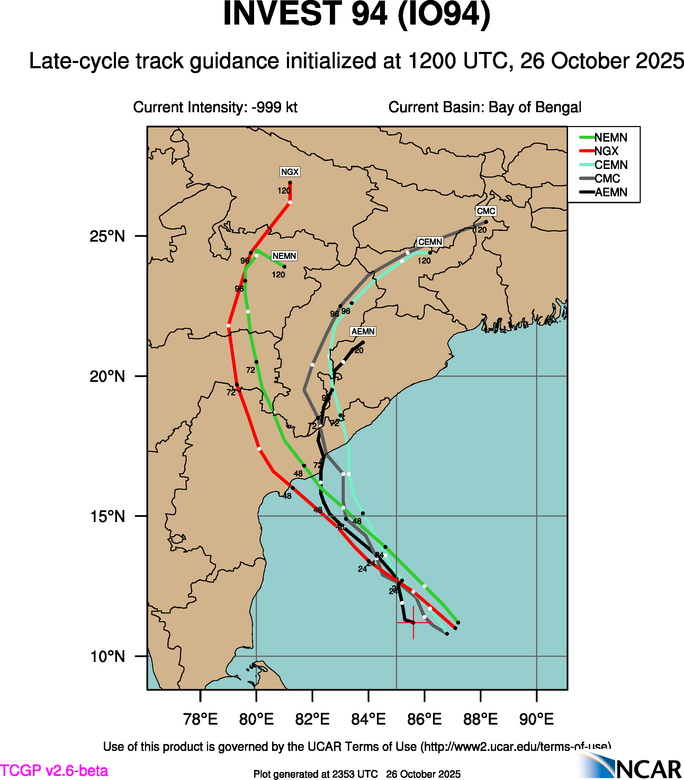 At 1200 UTC, 26 October 2025, INVEST 94 (IO94) was located in the Bay of Bengal basin at 11°N and 87.1°E. The current intensity was -999 kt and the center was moving at -999 kt at a bearing of -999 degrees. The minimum central pressure was -999 mb.