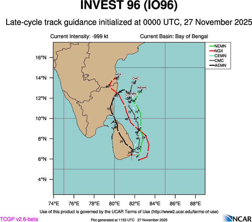 At 0000 UTC, 27 November 2025, INVEST 96 (IO96) was located in the Bay of Bengal basin at 5.9°N and 81.9°E. The current intensity was -999 kt and the center was moving at -999 kt at a bearing of -999 degrees. The minimum central pressure was -999 mb.