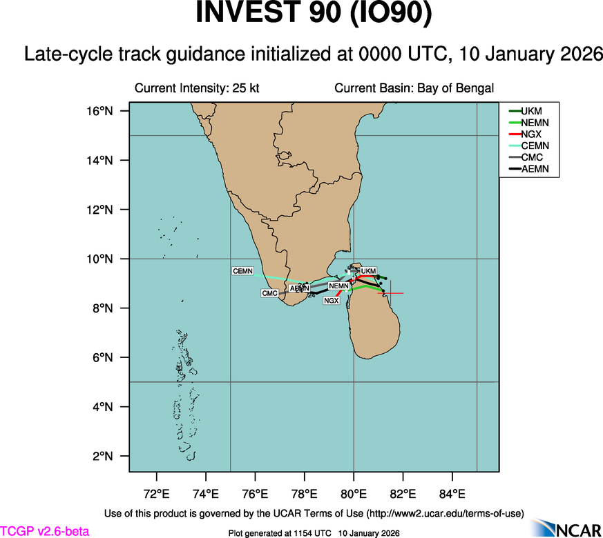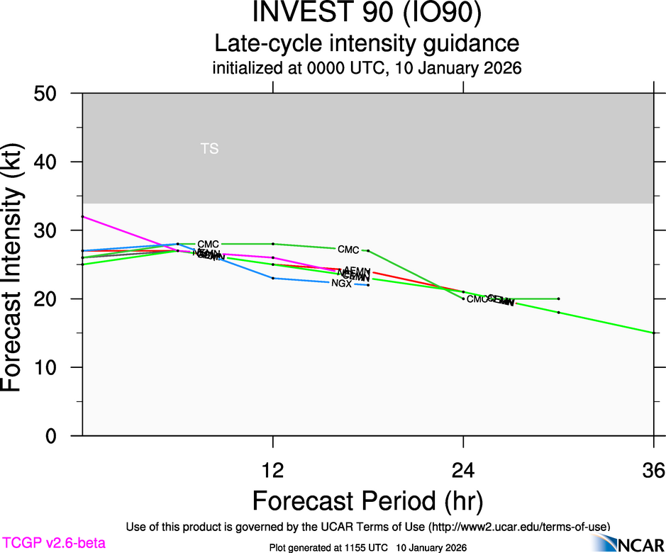 This page provides plots and information for INVEST 90 (IO90). The left side of this page provides TCGP-generated plots of numerical guidance and other TCGP-curated data. The right side of this page provides external links to additional information and products. Most of the model guidance displayed in the plots come from modeling centers outside of NCAR, such as NOAA, other national numerical weather prediction centers, and universities. Click here for information about who contributes to TCGP. Your use of this page is governed by the UCAR Terms of Service and this site's disclaimer. To obtain help for any item on this page, click on the question mark beside that item.