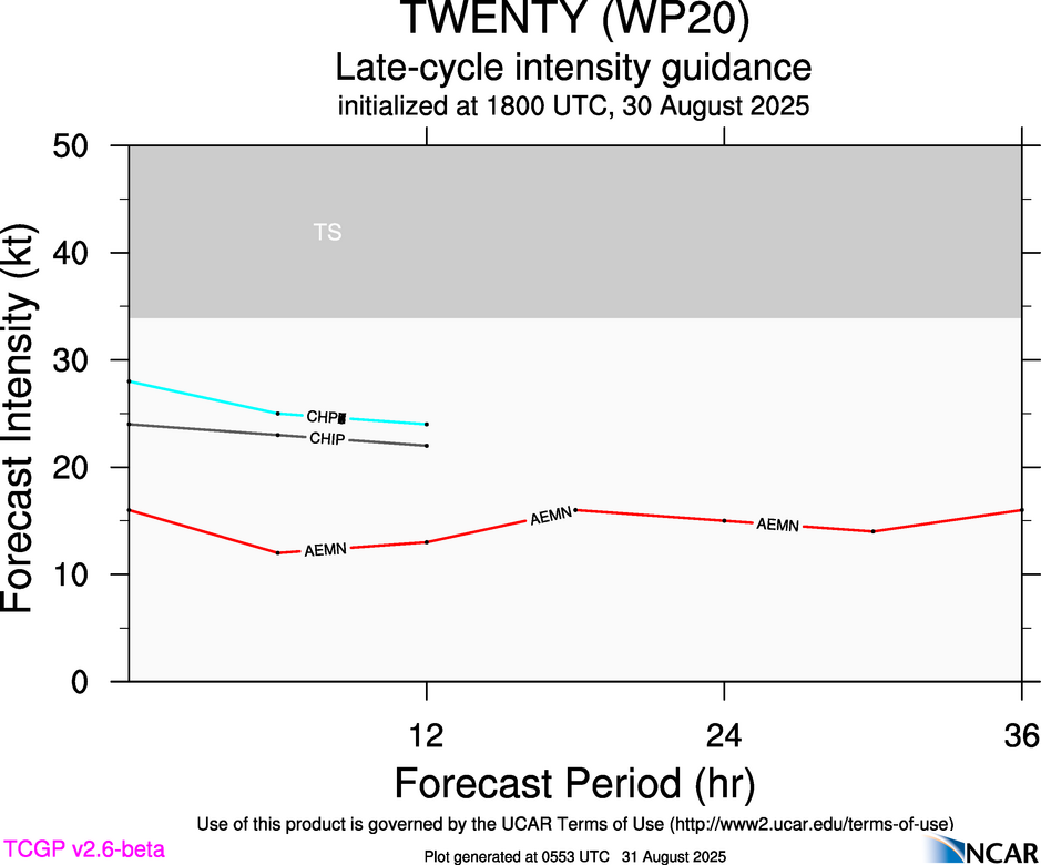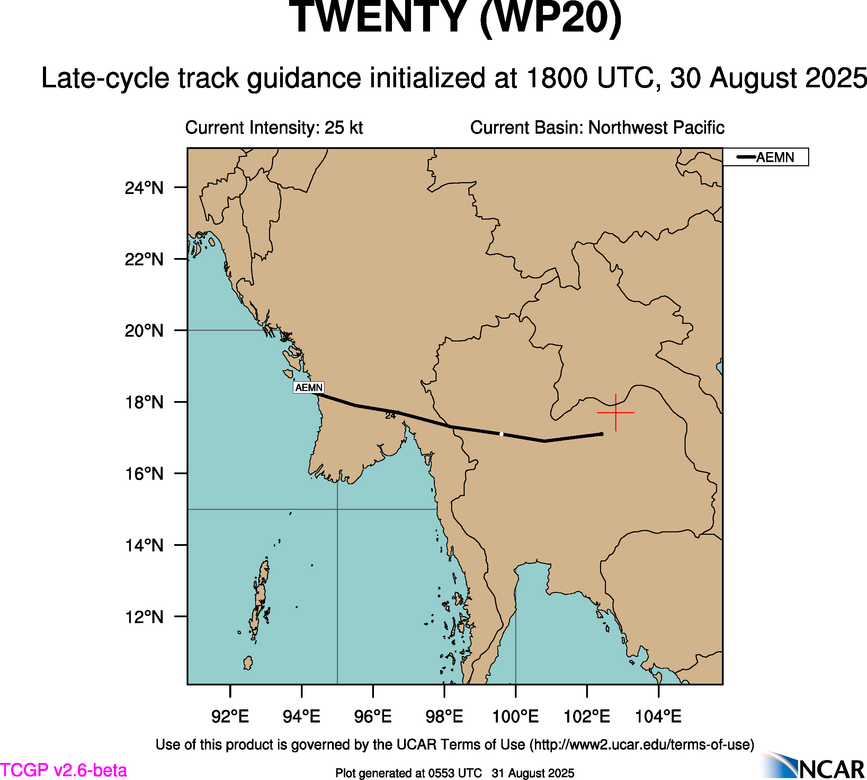 This page provides plots and information for TWENTY (WP20). The left side of this page provides TCGP-generated plots of numerical guidance and other TCGP-curated data. The right side of this page provides external links to additional information and products. Most of the model guidance displayed in the plots come from modeling centers outside of NCAR, such as NOAA, other national numerical weather prediction centers, and universities. Click here for information about who contributes to TCGP. Your use of this page is governed by the UCAR Terms of Service and this site's disclaimer. To obtain help for any item on this page, click on the question mark beside that item.