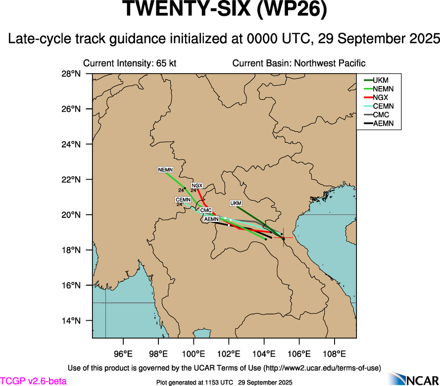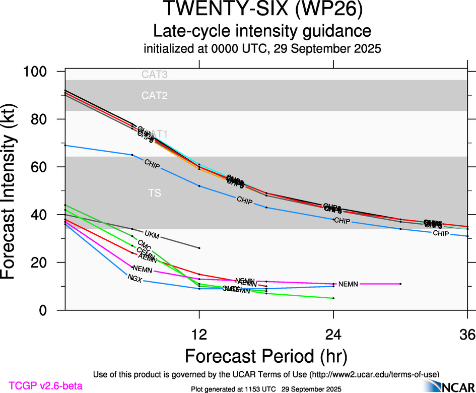 This page provides plots and information for TWENTY-SIX (WP26). The left side of this page provides TCGP-generated plots of numerical guidance and other TCGP-curated data. The right side of this page provides external links to additional information and products. Most of the model guidance displayed in the plots come from modeling centers outside of NCAR, such as NOAA, other national numerical weather prediction centers, and universities. Click here for information about who contributes to TCGP. Your use of this page is governed by the UCAR Terms of Service and this site's disclaimer. To obtain help for any item on this page, click on the question mark beside that item.