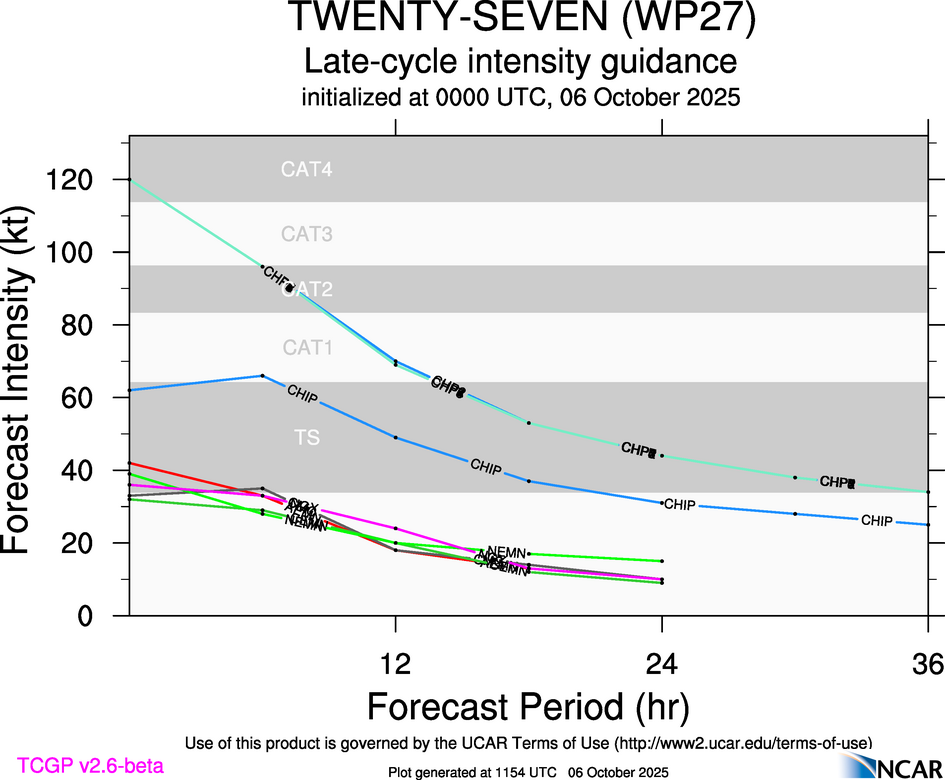 This page provides plots and information for TWENTY-SEVEN (WP27). The left side of this page provides TCGP-generated plots of numerical guidance and other TCGP-curated data. The right side of this page provides external links to additional information and products. Most of the model guidance displayed in the plots come from modeling centers outside of NCAR, such as NOAA, other national numerical weather prediction centers, and universities. Click here for information about who contributes to TCGP. Your use of this page is governed by the UCAR Terms of Service and this site's disclaimer. To obtain help for any item on this page, click on the question mark beside that item.