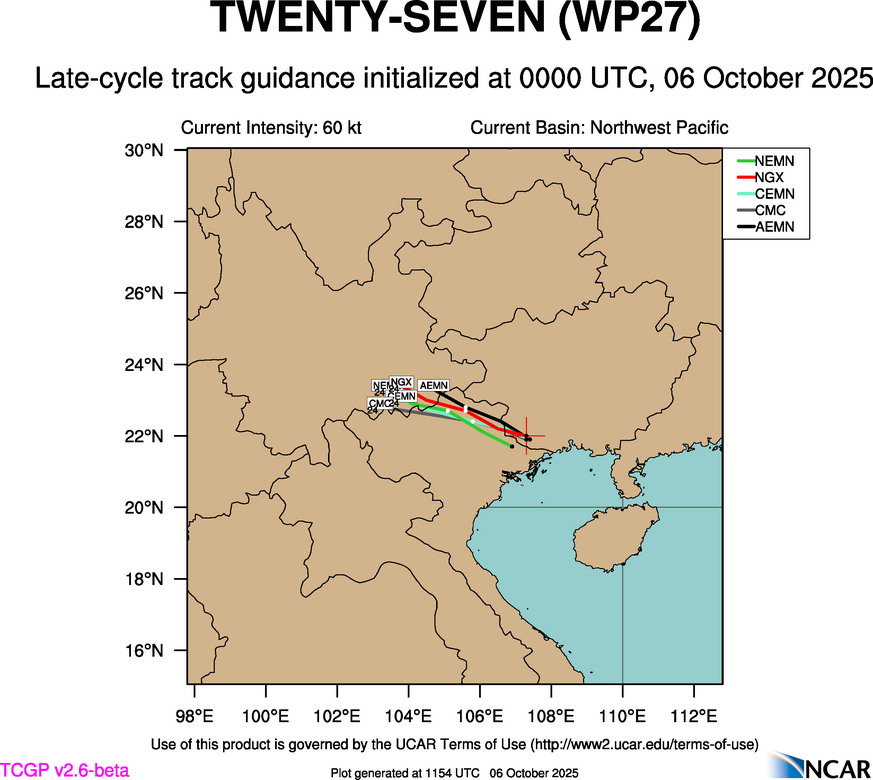 At 1200 UTC, 06 October 2025, TWENTY-SEVEN (WP27) was located in the Northwest Pacific basin at 23°N and 106.3°E. The current intensity was 30 kt and the center was moving at -999 kt at a bearing of -999 degrees. The minimum central pressure was -999 mb.