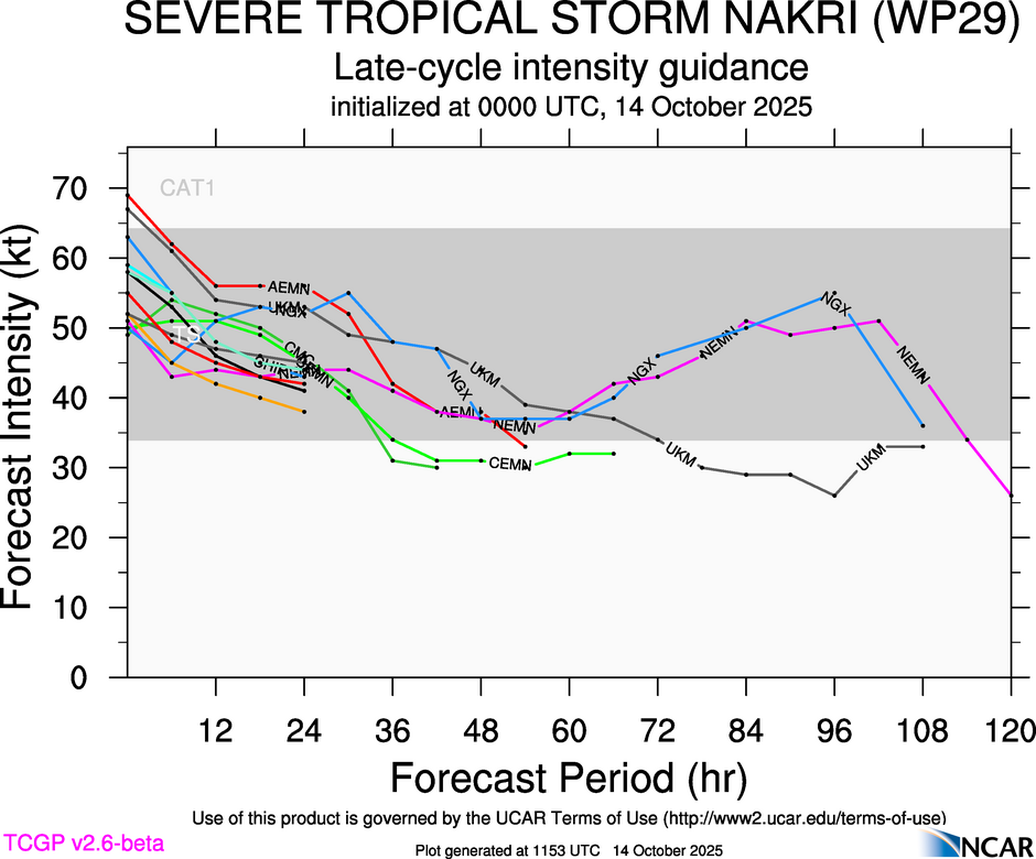 This page provides plots and information for TYPHOON NAKRI (WP29). The left side of this page provides TCGP-generated plots of numerical guidance and other TCGP-curated data. The right side of this page provides external links to additional information and products. Most of the model guidance displayed in the plots come from modeling centers outside of NCAR, such as NOAA, other national numerical weather prediction centers, and universities. Click here for information about who contributes to TCGP. Your use of this page is governed by the UCAR Terms of Service and this site's disclaimer. To obtain help for any item on this page, click on the question mark beside that item.