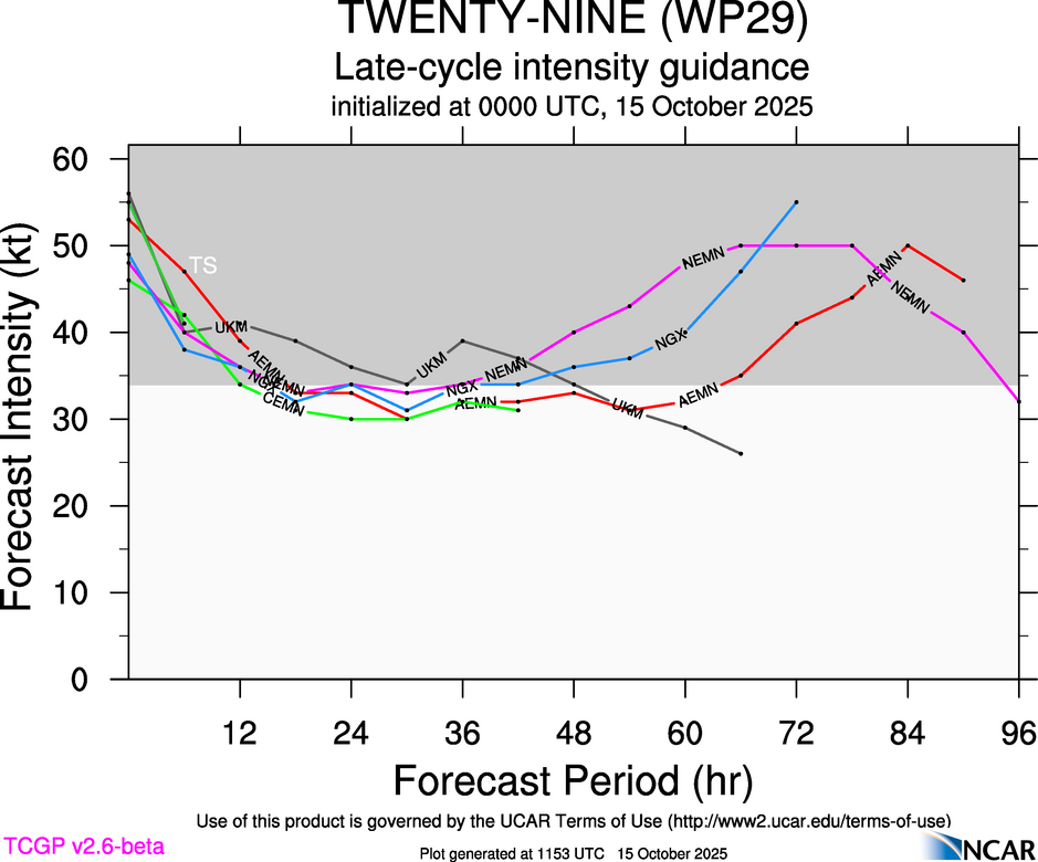 This page provides plots and information for TWENTY-NINE (WP29). The left side of this page provides TCGP-generated plots of numerical guidance and other TCGP-curated data. The right side of this page provides external links to additional information and products. Most of the model guidance displayed in the plots come from modeling centers outside of NCAR, such as NOAA, other national numerical weather prediction centers, and universities. Click here for information about who contributes to TCGP. Your use of this page is governed by the UCAR Terms of Service and this site's disclaimer. To obtain help for any item on this page, click on the question mark beside that item.