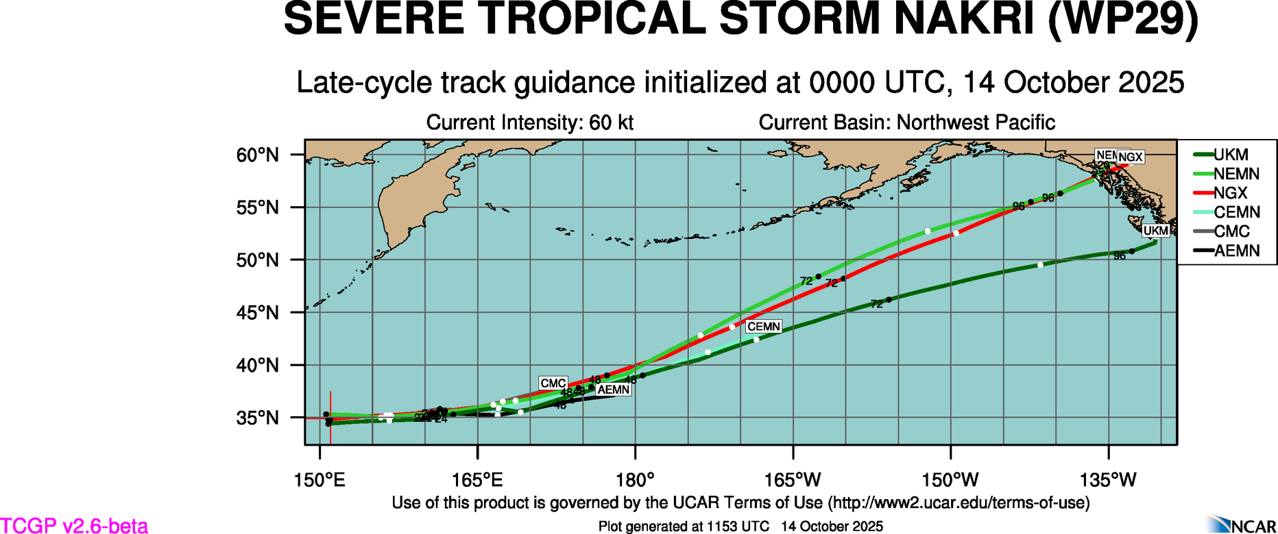At 0600 UTC, 14 October 2025, TYPHOON NAKRI (WP29) was located in the Northwest Pacific basin at 35°N and 154.6°E. The current intensity was 70 kt and the center was moving at 26 kt at a bearing of 80 degrees. The minimum central pressure was 979 mb.