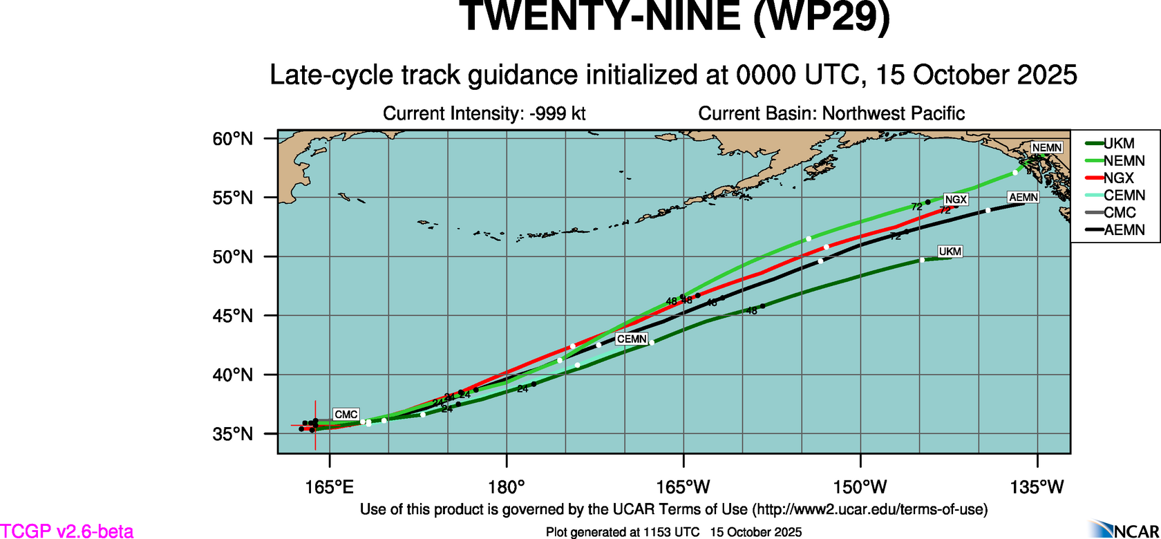 At 0600 UTC, 15 October 2025, TWENTY-NINE (WP29) was located in the Northwest Pacific basin at 34°N and 164.7°E. The current intensity was 55 kt and the center was moving at -999 kt at a bearing of -999 degrees. The minimum central pressure was -999 mb.