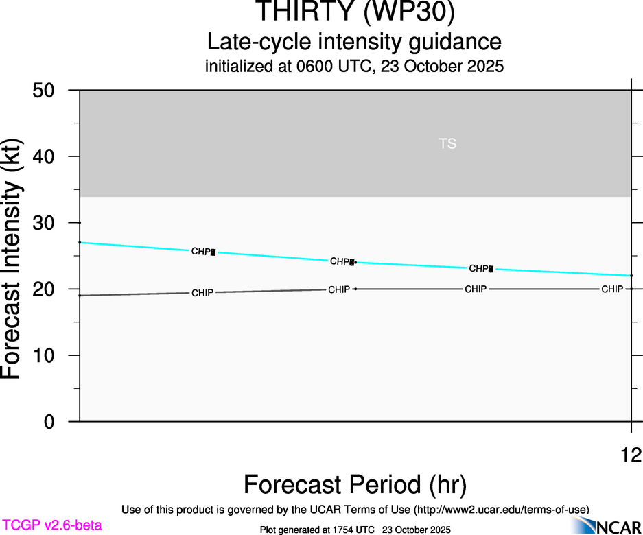 This page provides plots and information for THIRTY (WP30). The left side of this page provides TCGP-generated plots of numerical guidance and other TCGP-curated data. The right side of this page provides external links to additional information and products. Most of the model guidance displayed in the plots come from modeling centers outside of NCAR, such as NOAA, other national numerical weather prediction centers, and universities. Click here for information about who contributes to TCGP. Your use of this page is governed by the UCAR Terms of Service and this site's disclaimer. To obtain help for any item on this page, click on the question mark beside that item.