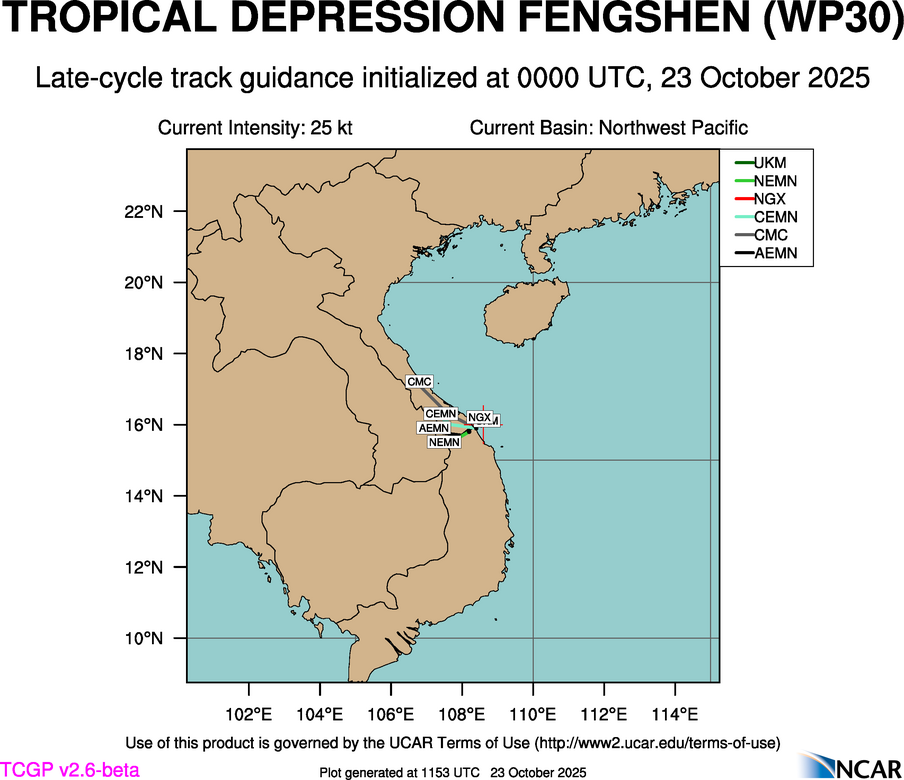 At 1200 UTC, 23 October 2025, THIRTY (WP30) was located in the Northwest Pacific basin at 15.6°N and 108°E. The current intensity was 15 kt and the center was moving at -999 kt at a bearing of -999 degrees. The minimum central pressure was -999 mb.