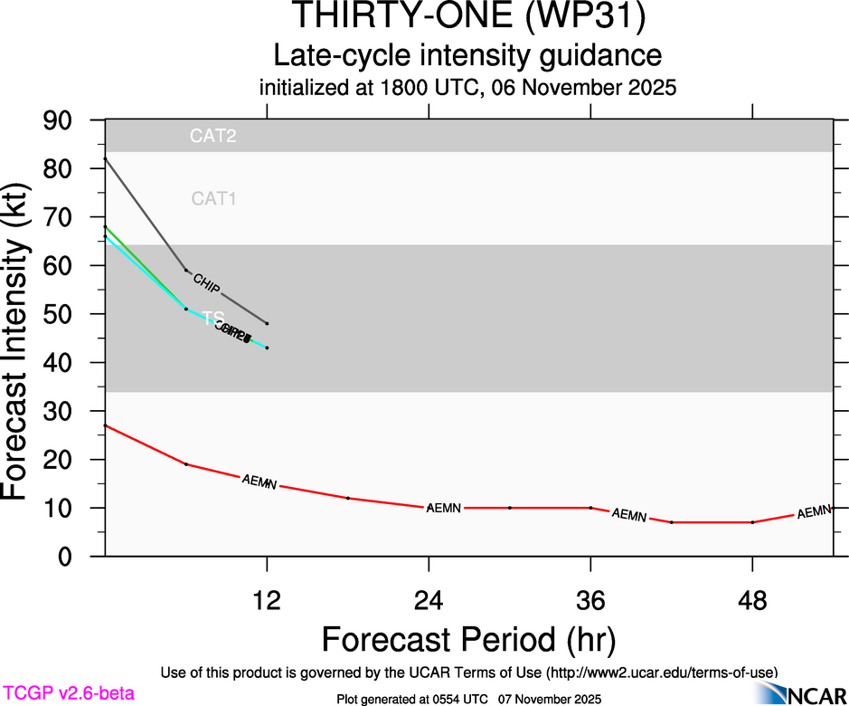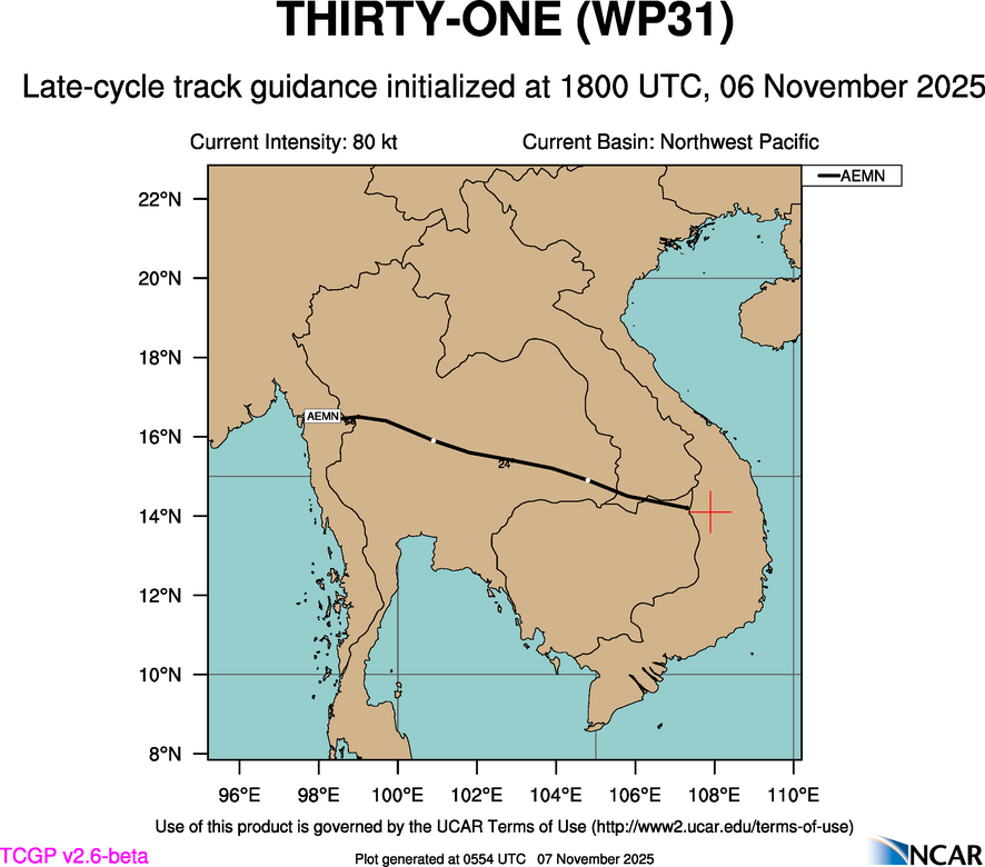 This page provides plots and information for THIRTY-ONE (WP31). The left side of this page provides TCGP-generated plots of numerical guidance and other TCGP-curated data. The right side of this page provides external links to additional information and products. Most of the model guidance displayed in the plots come from modeling centers outside of NCAR, such as NOAA, other national numerical weather prediction centers, and universities. Click here for information about who contributes to TCGP. Your use of this page is governed by the UCAR Terms of Service and this site's disclaimer. To obtain help for any item on this page, click on the question mark beside that item.