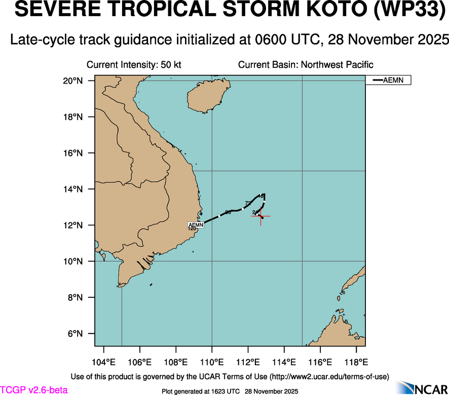 At 1200 UTC, 28 November 2025, SEVERE TROPICAL STORM KOTO (WP33) was located in the Northwest Pacific basin at 12.7°N and 112.4°E. The current intensity was 50 kt and the center was moving at 3 kt at a bearing of 285 degrees. The minimum central pressure was 993 mb.