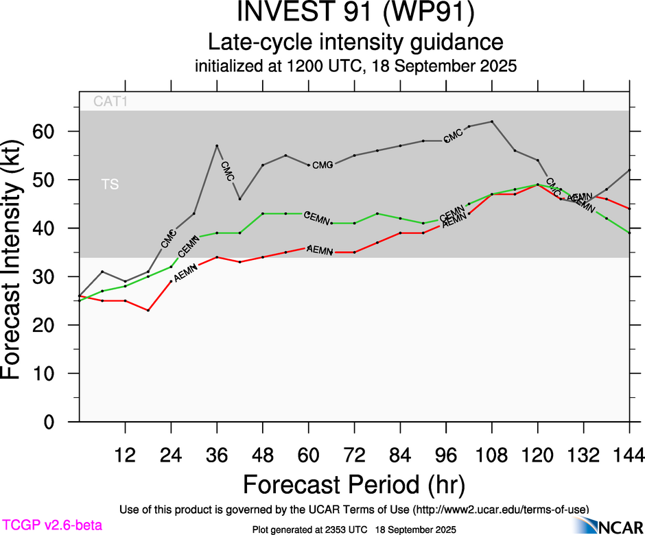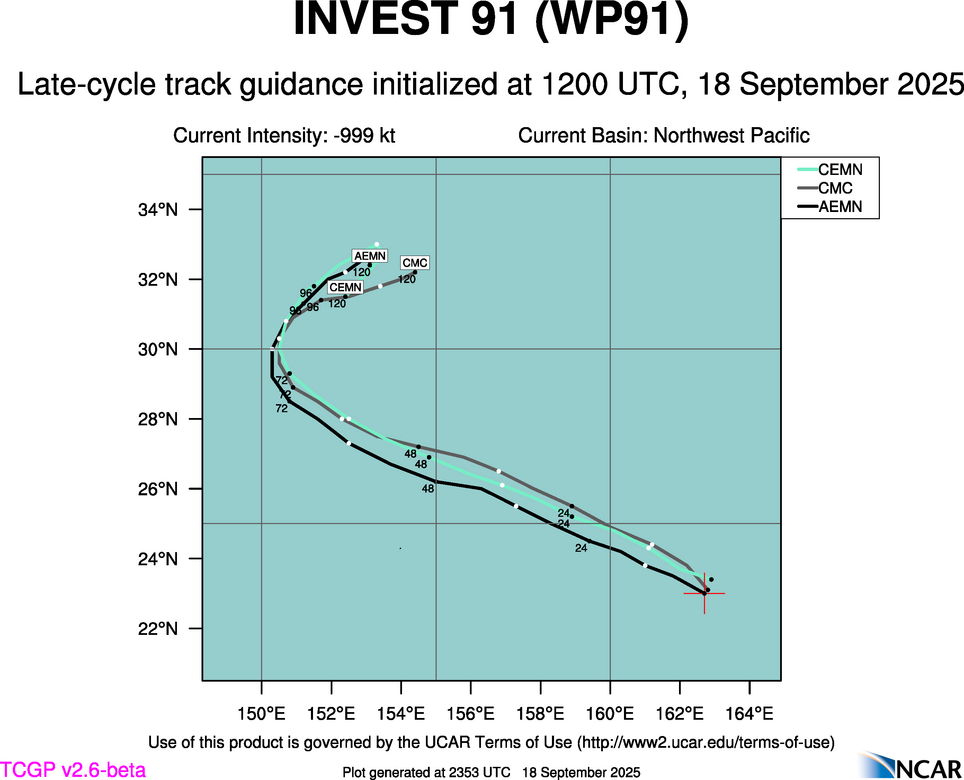 This page provides plots and information for INVEST 91 (WP91). The left side of this page provides TCGP-generated plots of numerical guidance and other TCGP-curated data. The right side of this page provides external links to additional information and products. Most of the model guidance displayed in the plots come from modeling centers outside of NCAR, such as NOAA, other national numerical weather prediction centers, and universities. Click here for information about who contributes to TCGP. Your use of this page is governed by the UCAR Terms of Service and this site's disclaimer. To obtain help for any item on this page, click on the question mark beside that item.