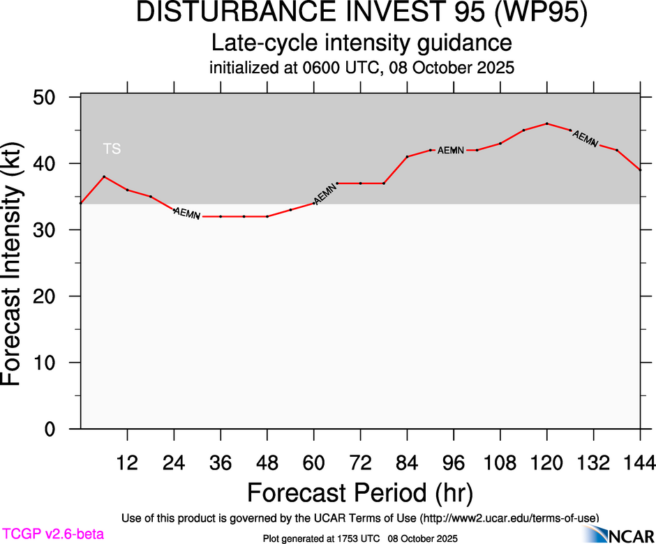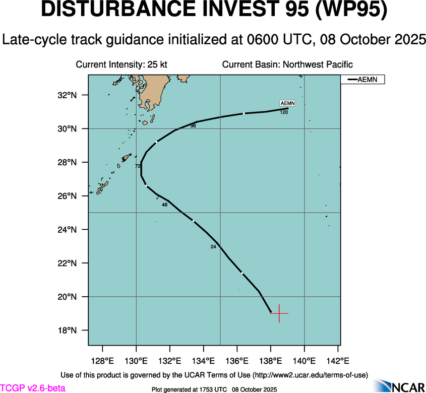 At 0600 UTC, 08 October 2025, DISTURBANCE INVEST 95 (WP95) was located in the Northwest Pacific basin at 19°N and 138.5°E. The current intensity was 25 kt and the center was moving at 13 kt at a bearing of 320 degrees. The minimum central pressure was 1001 mb.
