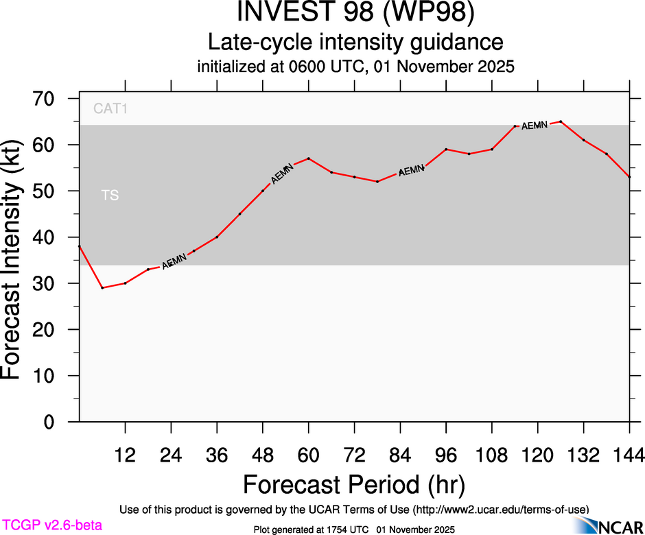 This page provides plots and information for INVEST 98 (WP98). The left side of this page provides TCGP-generated plots of numerical guidance and other TCGP-curated data. The right side of this page provides external links to additional information and products. Most of the model guidance displayed in the plots come from modeling centers outside of NCAR, such as NOAA, other national numerical weather prediction centers, and universities. Click here for information about who contributes to TCGP. Your use of this page is governed by the UCAR Terms of Service and this site's disclaimer. To obtain help for any item on this page, click on the question mark beside that item.