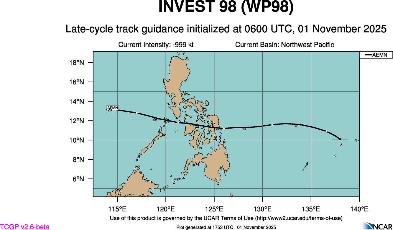 At 0600 UTC, 01 November 2025, INVEST 98 (WP98) was located in the Northwest Pacific basin at 10.5°N and 137.8°E. The current intensity was -999 kt and the center was moving at -999 kt at a bearing of -999 degrees. The minimum central pressure was -999 mb.