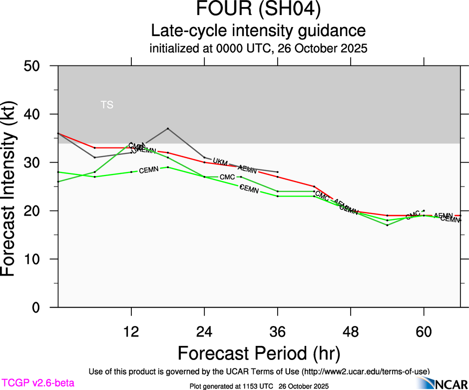 This page provides plots and information for FOUR (SH04). The left side of this page provides TCGP-generated plots of numerical guidance and other TCGP-curated data. The right side of this page provides external links to additional information and products. Most of the model guidance displayed in the plots come from modeling centers outside of NCAR, such as NOAA, other national numerical weather prediction centers, and universities. Click here for information about who contributes to TCGP. Your use of this page is governed by the UCAR Terms of Service and this site's disclaimer. To obtain help for any item on this page, click on the question mark beside that item.