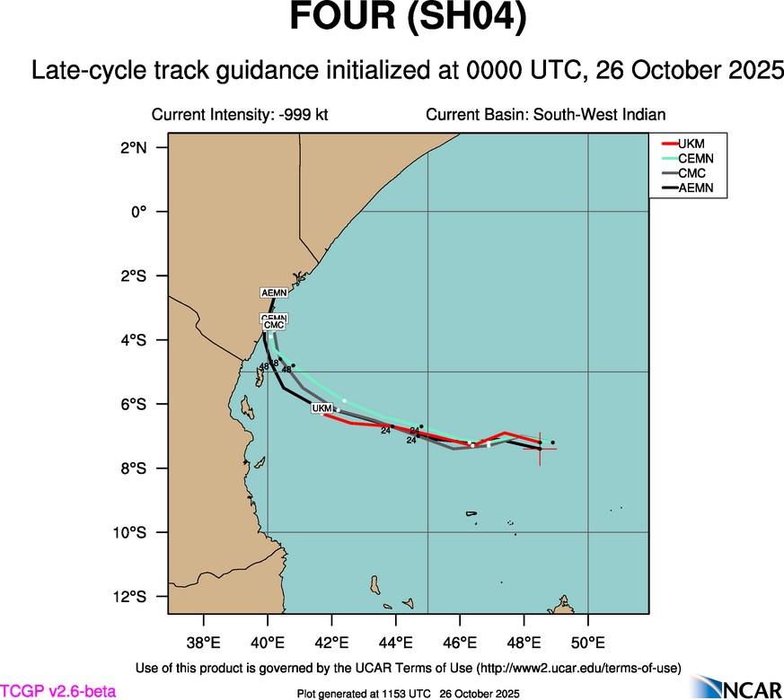 At 0600 UTC, 28 October 2025, FOUR (SH04) was located in the South-West Indian basin at 4.1°S and 39.7°E. The current intensity was 15 kt and the center was moving at -999 kt at a bearing of -999 degrees. The minimum central pressure was -999 mb.