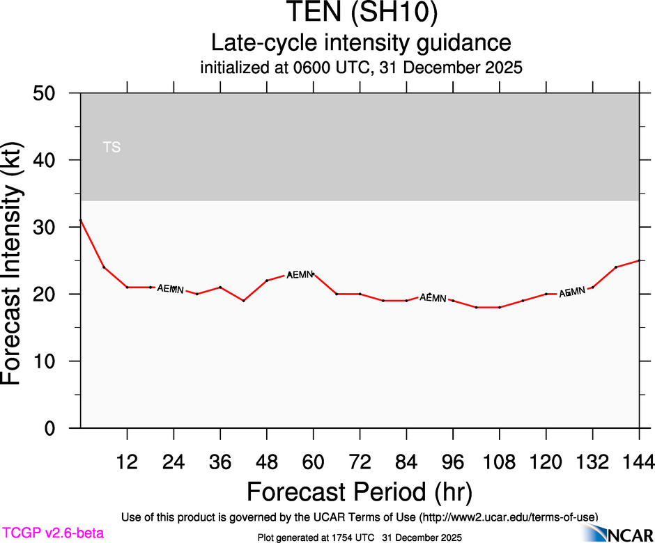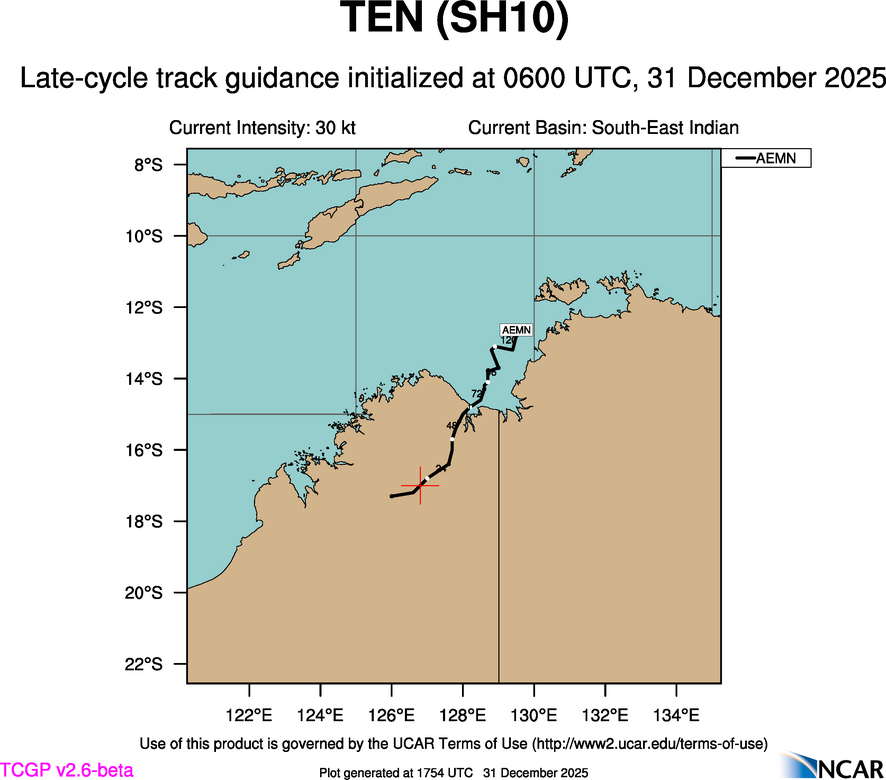 At 1800 UTC, 01 January 2026, TEN (SH10) was located in the South-East Indian basin at 15°S and 130.6°E. The current intensity was 15 kt and the center was moving at -999 kt at a bearing of -999 degrees. The minimum central pressure was -999 mb.