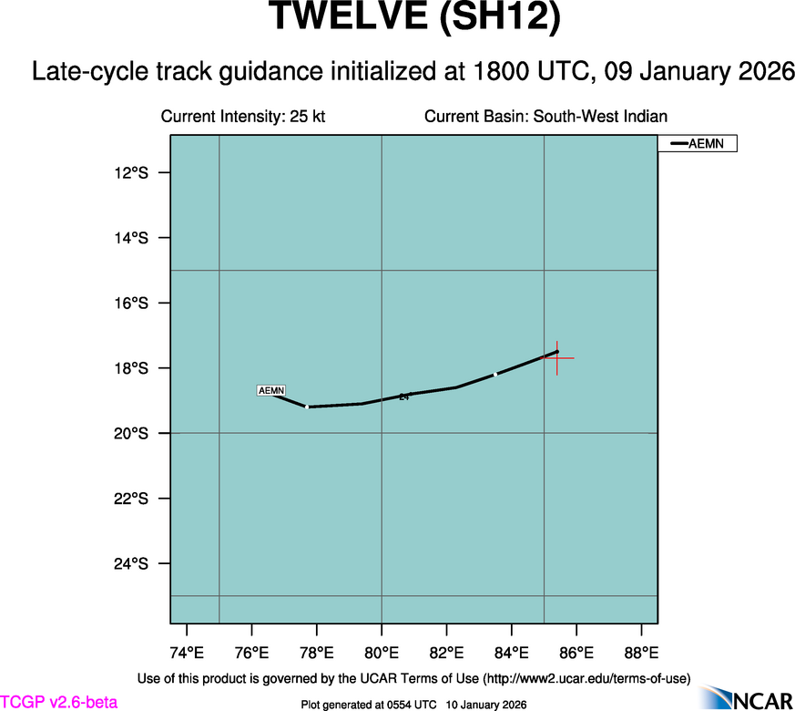 This page provides plots and information for TWELVE (SH12). The left side of this page provides TCGP-generated plots of numerical guidance and other TCGP-curated data. The right side of this page provides external links to additional information and products. Most of the model guidance displayed in the plots come from modeling centers outside of NCAR, such as NOAA, other national numerical weather prediction centers, and universities. Click here for information about who contributes to TCGP. Your use of this page is governed by the UCAR Terms of Service and this site's disclaimer. To obtain help for any item on this page, click on the question mark beside that item.