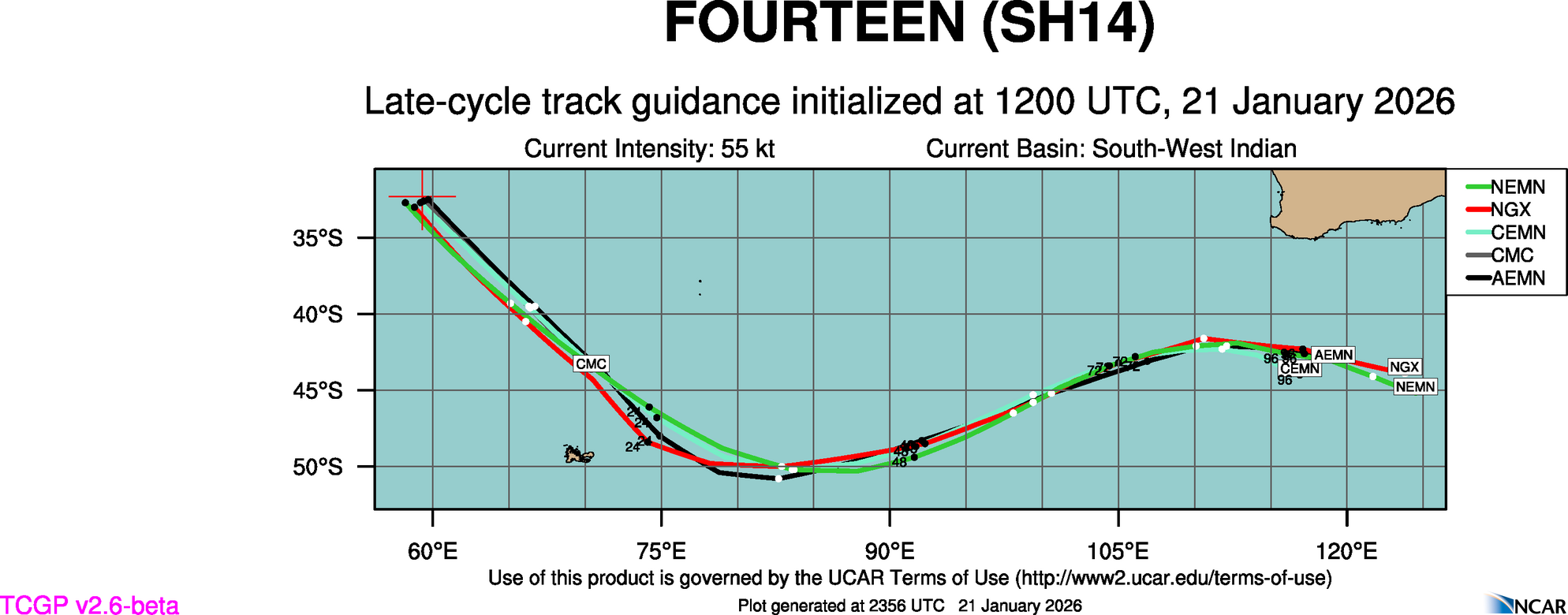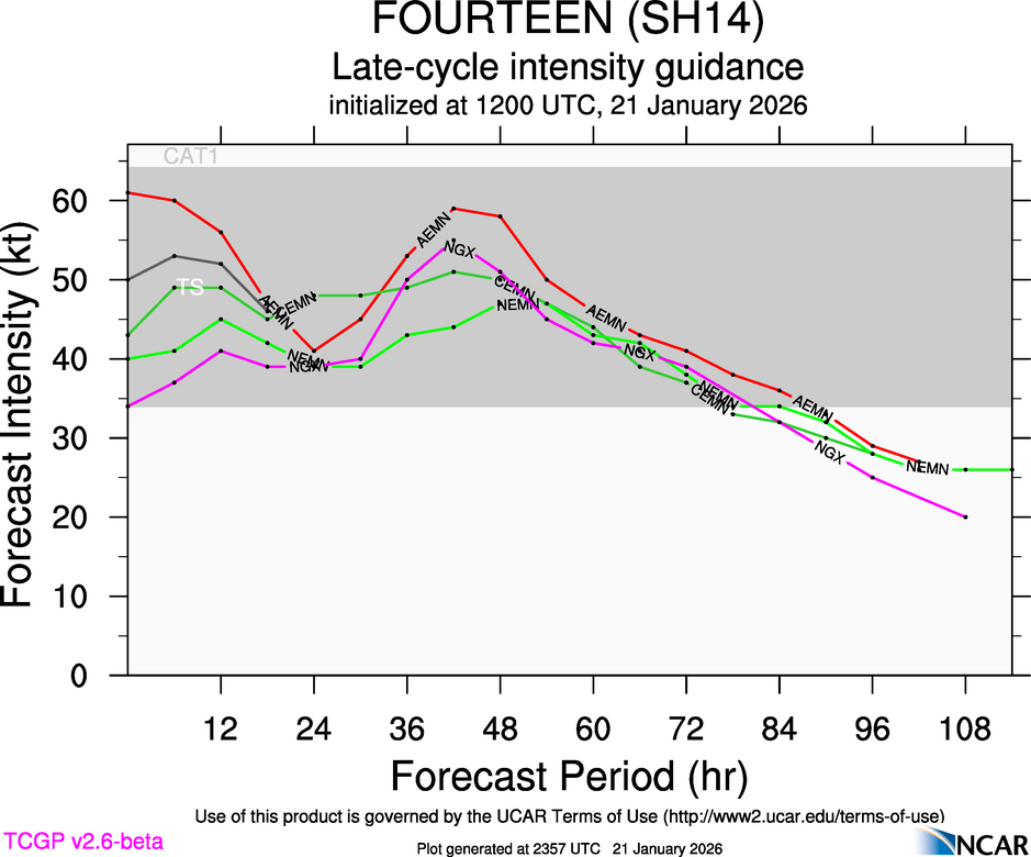 This page provides plots and information for FOURTEEN (SH14). The left side of this page provides TCGP-generated plots of numerical guidance and other TCGP-curated data. The right side of this page provides external links to additional information and products. Most of the model guidance displayed in the plots come from modeling centers outside of NCAR, such as NOAA, other national numerical weather prediction centers, and universities. Click here for information about who contributes to TCGP. Your use of this page is governed by the UCAR Terms of Service and this site's disclaimer. To obtain help for any item on this page, click on the question mark beside that item.