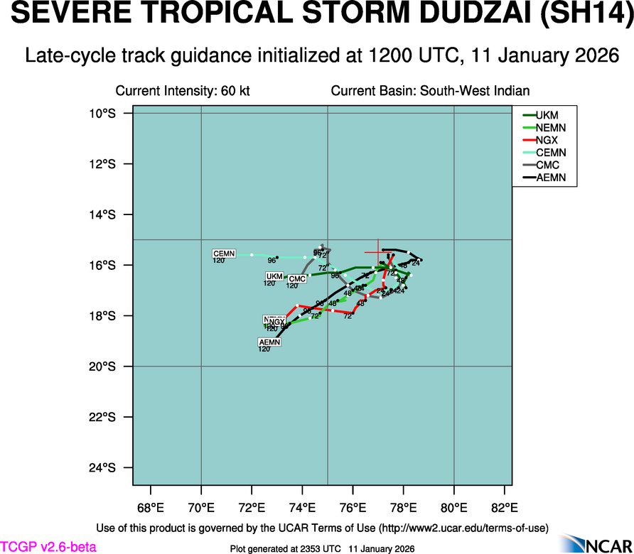 At 1800 UTC, 11 January 2026, TROPICAL CYCLONE DUDZAI (SH14) was located in the South-West Indian basin at 16°S and 77.4°E. The current intensity was 75 kt and the center was moving at 6 kt at a bearing of 150 degrees. The minimum central pressure was 979 mb.