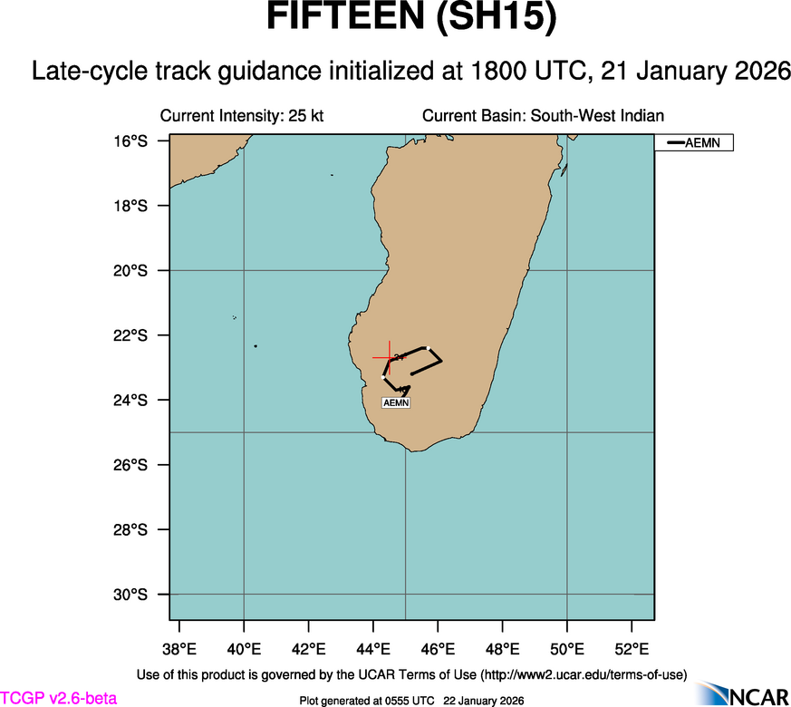 At 0600 UTC, 22 January 2026, FIFTEEN (SH15) was located in the South-West Indian basin at 21°S and 43.6°E. The current intensity was 15 kt and the center was moving at -999 kt at a bearing of -999 degrees. The minimum central pressure was -999 mb.