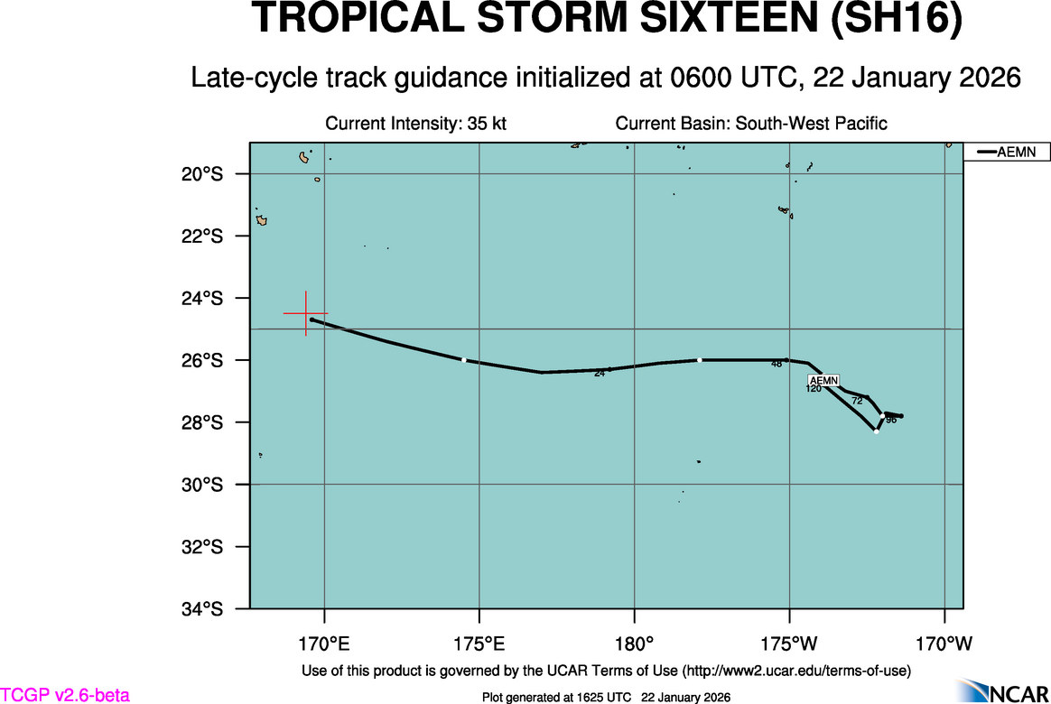 At 1200 UTC, 22 January 2026, TROPICAL STORM SIXTEEN (SH16) was located in the South-West Pacific basin at 25.2°S and 172.4°E. The current intensity was 40 kt and the center was moving at 25 kt at a bearing of 115 degrees. The minimum central pressure was 998 mb.