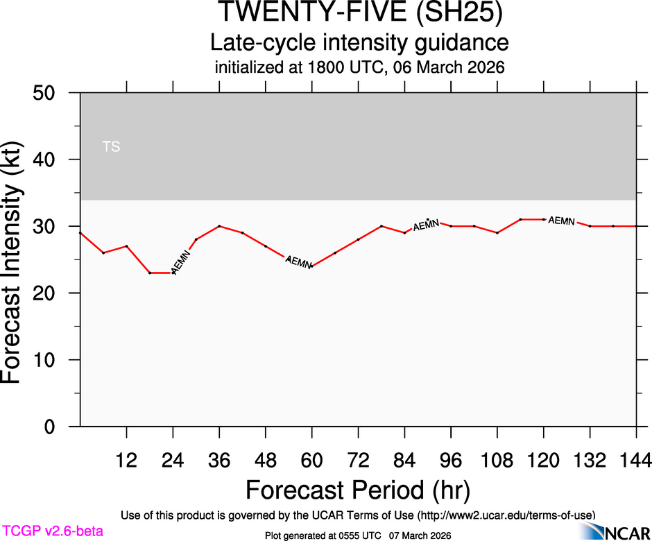 This page provides plots and information for TWENTY-FIVE (SH25). The left side of this page provides TCGP-generated plots of numerical guidance and other TCGP-curated data. The right side of this page provides external links to additional information and products. Most of the model guidance displayed in the plots come from modeling centers outside of NCAR, such as NOAA, other national numerical weather prediction centers, and universities. Click here for information about who contributes to TCGP. Your use of this page is governed by the UCAR Terms of Service and this site's disclaimer. To obtain help for any item on this page, click on the question mark beside that item.